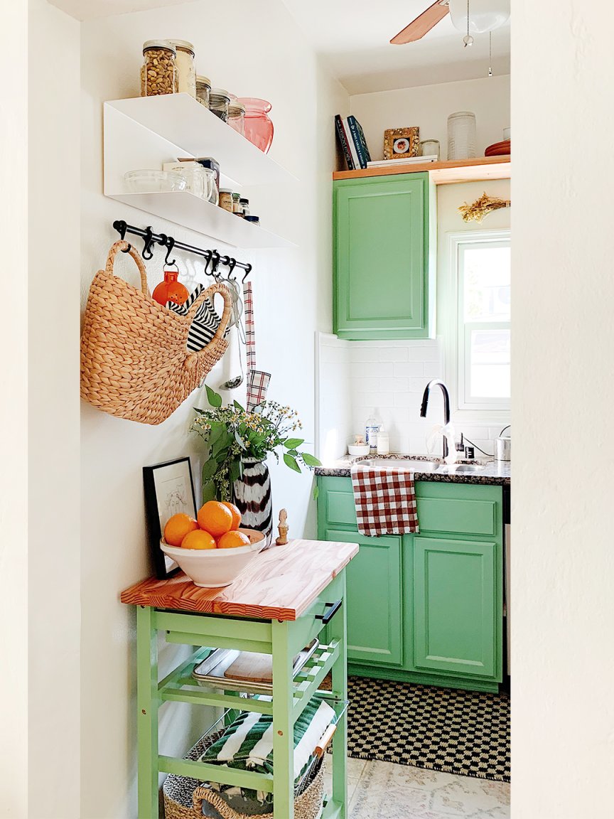 The seasoned rental renovator had already painted her small Home Depot rolling cart the same green as the cabinets, but to make it really look like a custom island, she had Lucas switch out the old granite top for a slab of butcher block, too. Like the floating shelf, the countertop needs occasional oiling every couple of months to maintain its natural, warm tone.