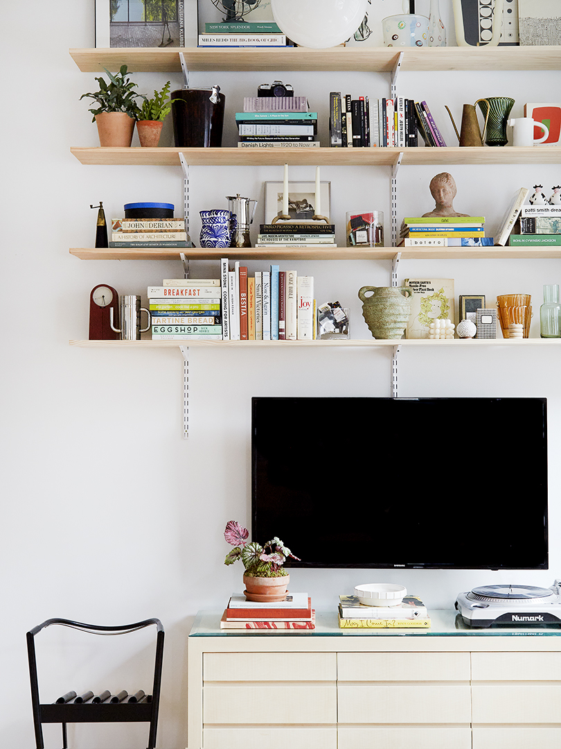 What resulted was not only a utilitarian storage system sturdy enough to withhold more shopping finds, but also an update on the classic gallery wall that acts as the apartment’s centerpiece above the entertainment hub. Below, Stevens outlines her top tips for styling (and restyling) shelf systems, keeping practicality top of mind.