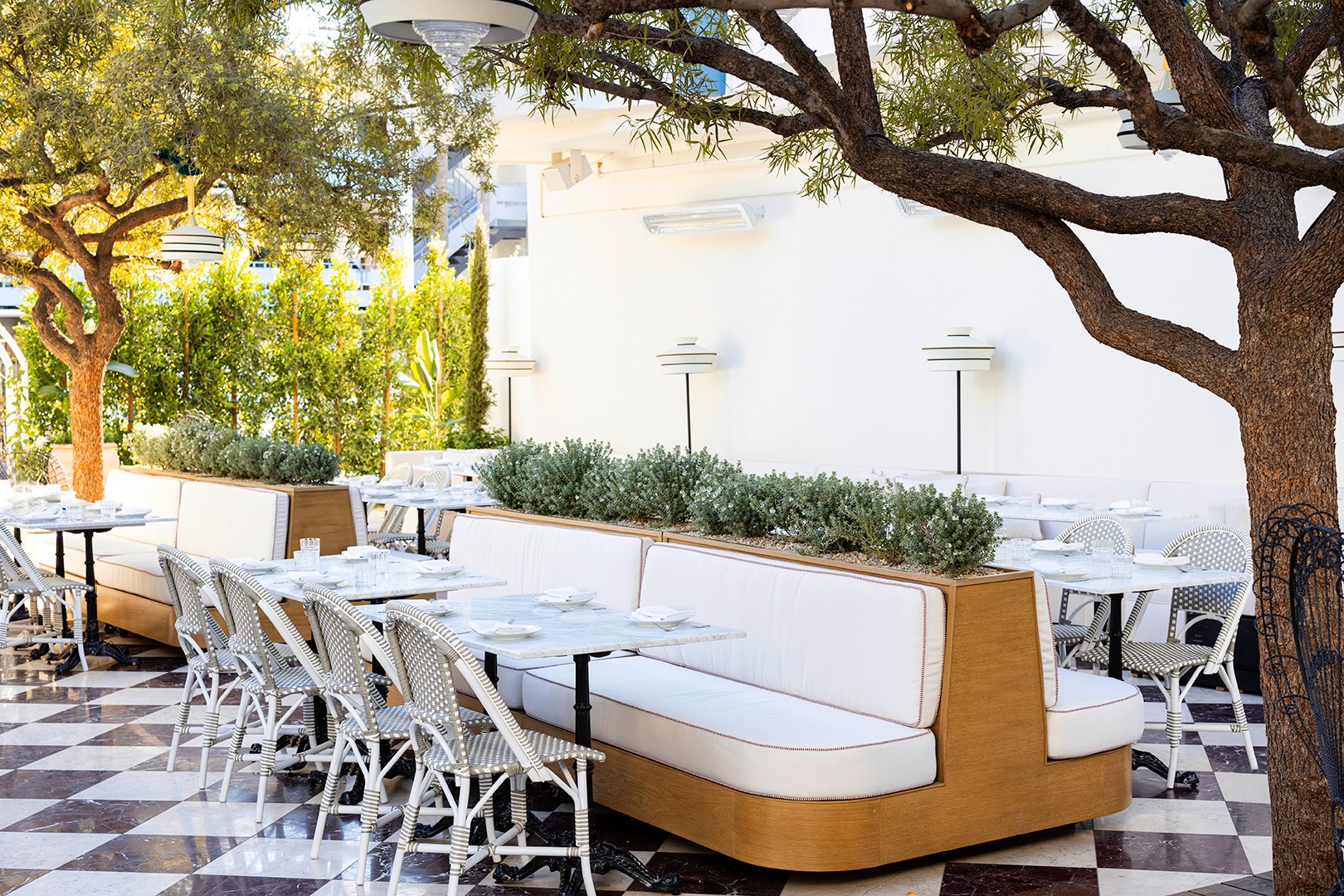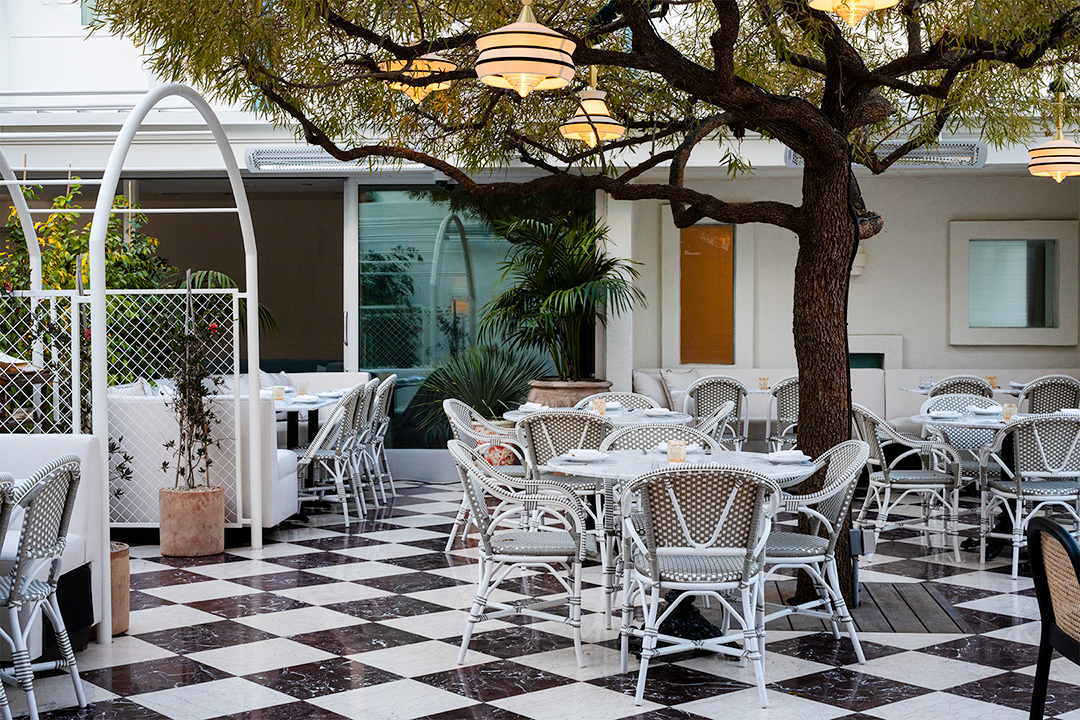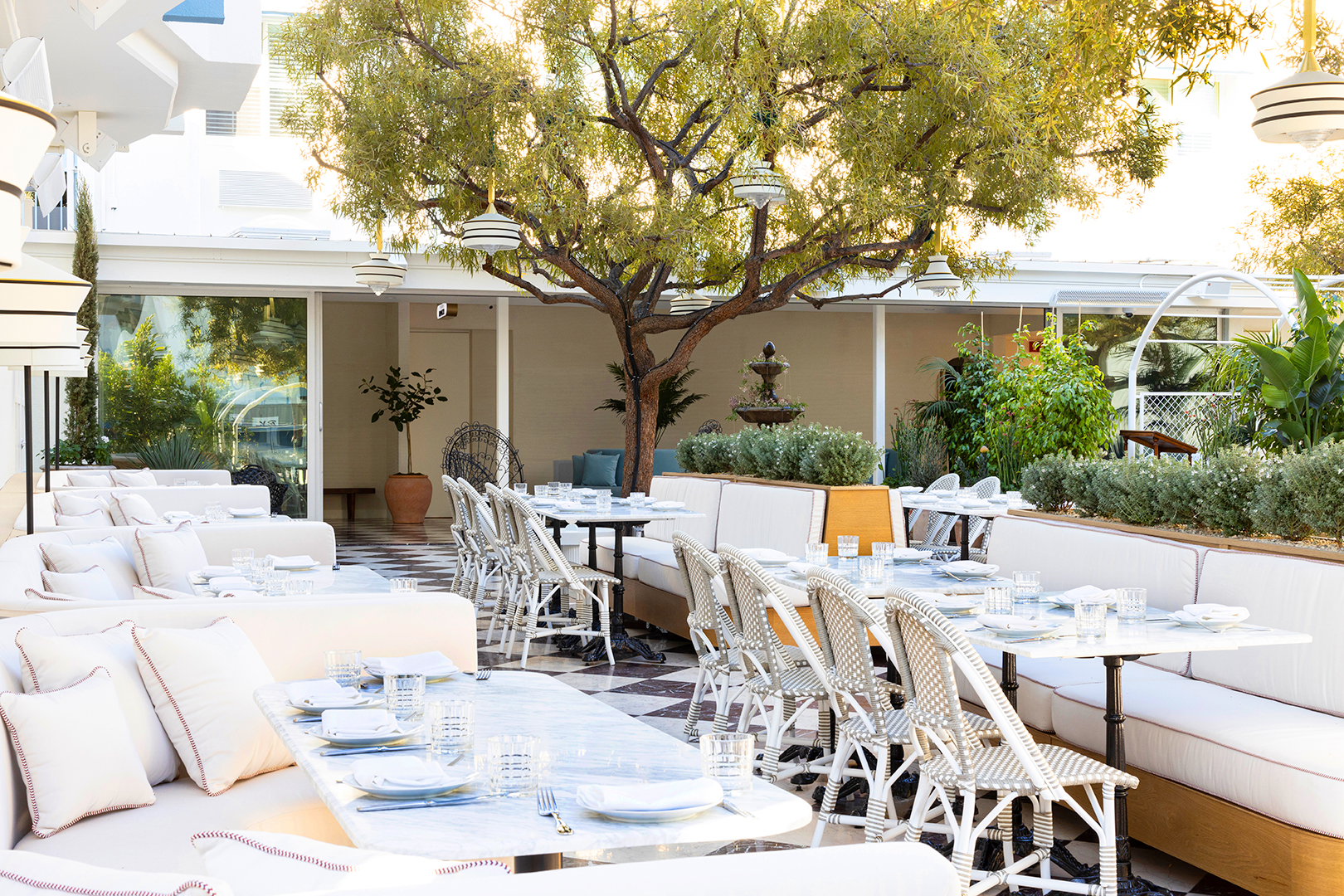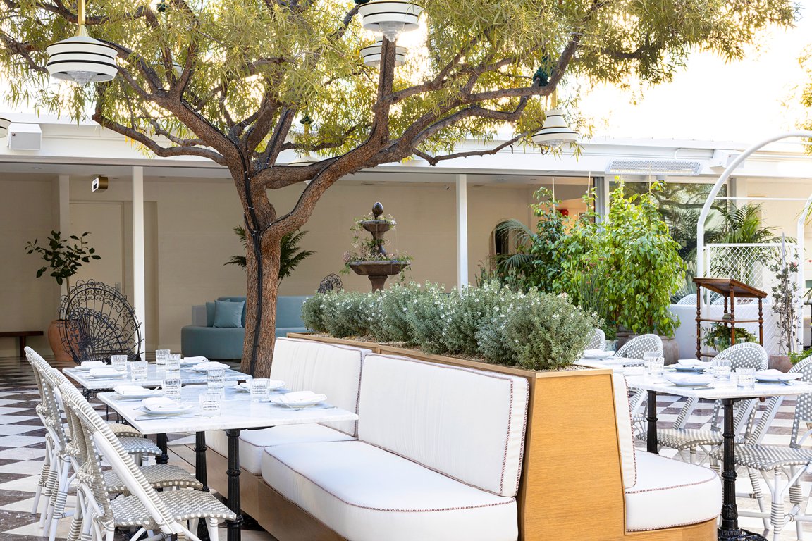 But you won’t spot any actual umbrellas here. Instead, the California-cool dining nooks are strategically placed in the shade beneath the tree canopies, offering natural relief from the hot L.A. sun.