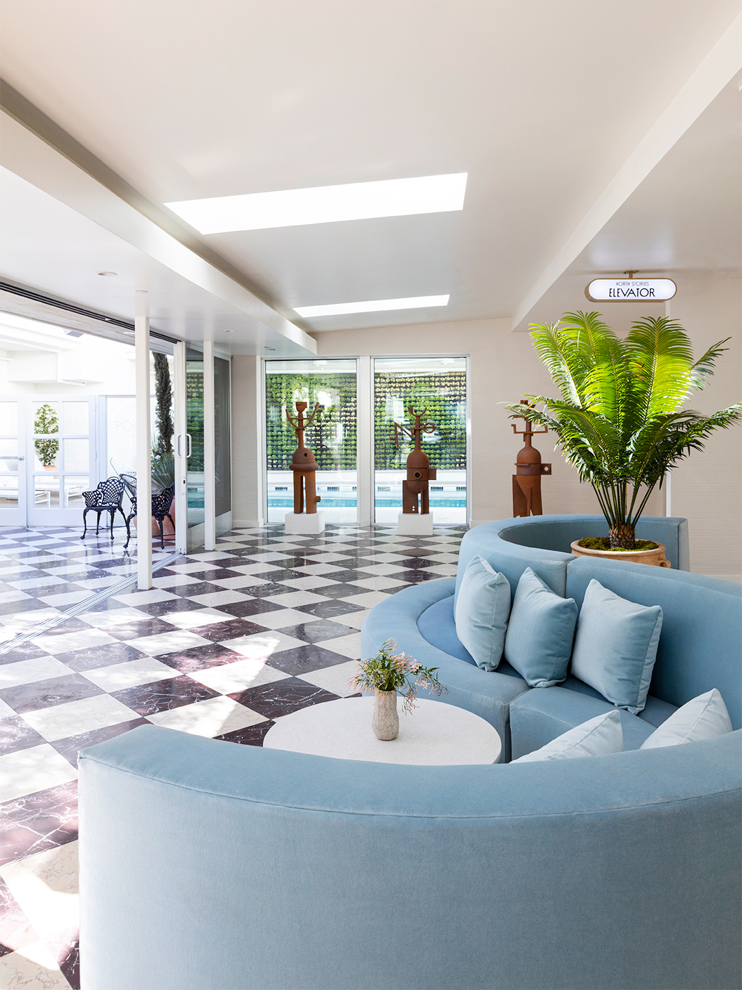 Perhaps the most significant way Grifka and Klein blur the lines between indoors and out is beneath your feet. Instead of pavement, grass, or gravel, the duo went with an ultra-luxe marble. Of course, the stone is naturally hard-wearing enough to work as outdoor flooring (and honed to be anti-slip!), but by cutting each into diamond shapes (not squares—the measurements are slightly different and a bit more pricey to get right), the contrast between the material’s white and dark red hues is emphasized. The look is more upscale kitchen than backyard. It’s also the same tile you’ll spot in the lobby entrance. “The flooring that runs from inside to out makes a huge difference in creating a single space,” explains Grifka.