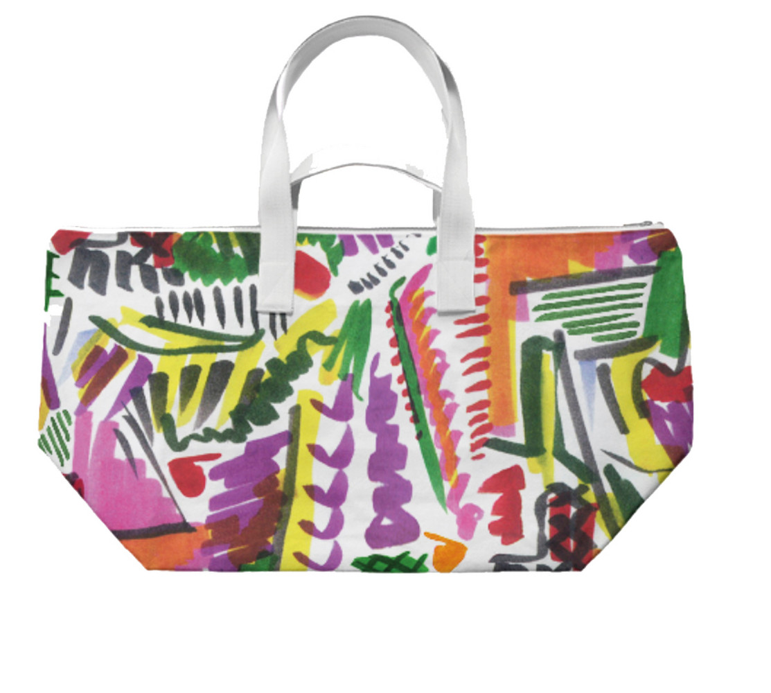 A mishmash of color and pattern, this lively duffel instantly transports you to the beach.