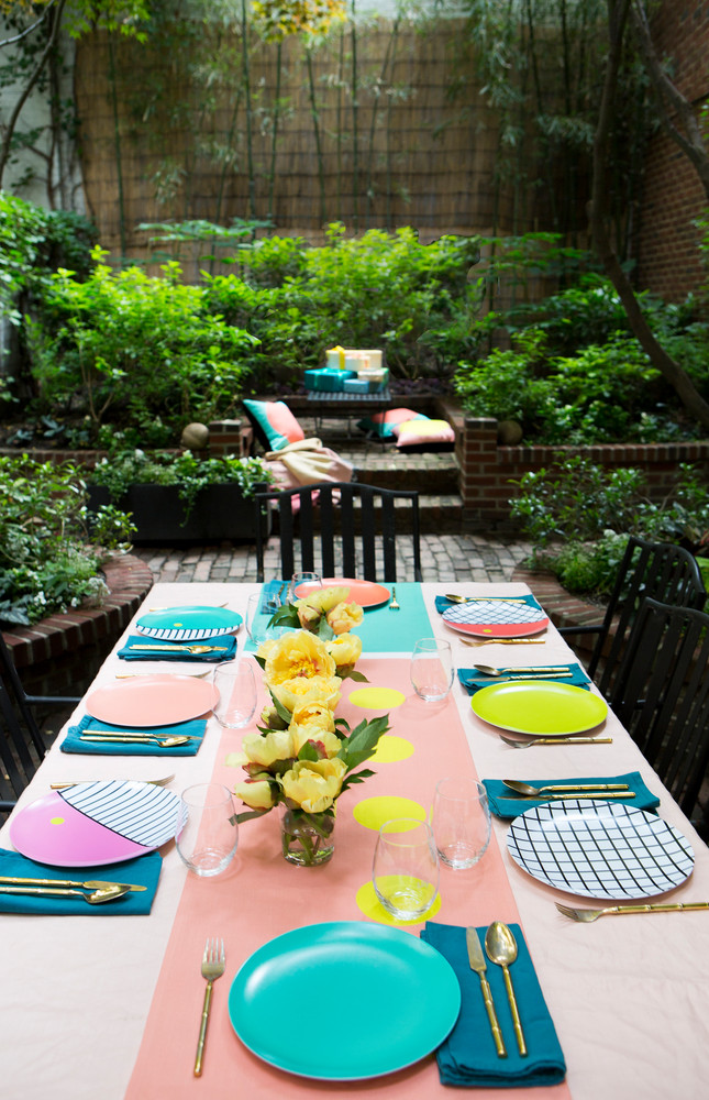 Our editors love setting the table with bright pops of color, and our entire team is obsessed with the melamine plates from Shutterfly. You can use them indoors with kids or outdoors for a backyard bash. We created a range of plates with a simple graphic pattern so we could create a landscape on the table. Plates are the foundation of a strong tablescape, so designing the plates for this party revolved around solid plates in a rainbow of pretty colors and tennis inspired designs.
