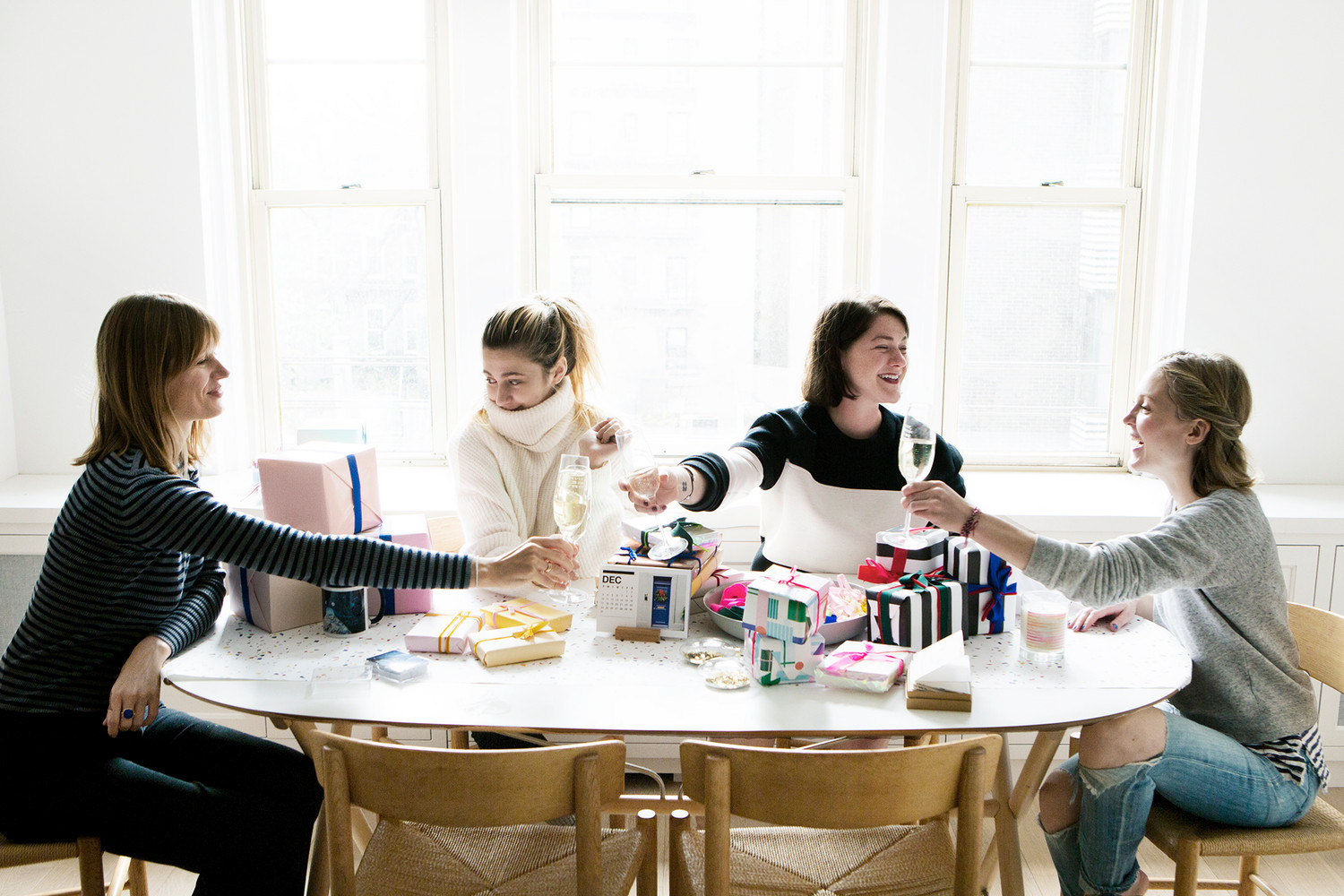To show off our gifts and share holiday stories, we got together for a fun and casual wrapping party with entertaining essentials we designed on Shutterfly: colorful melamine plates, champagne flutes etched with our favorite holiday catchphrase, and a personalized cutting board. Inspired by all things gift wrap, we turned on our favorite holiday tunes and set up our own little Santa’s workshop while we sipped bubbly and munched on a cheese plate.
