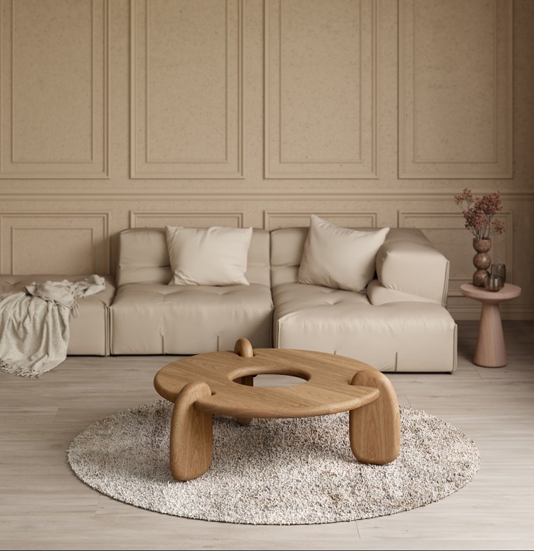 This standout chair by Estudio Persona features a round wooden seat with a leather-upholstered cylindrical back. The result is a beautiful monochromatic piece that marries form and function.