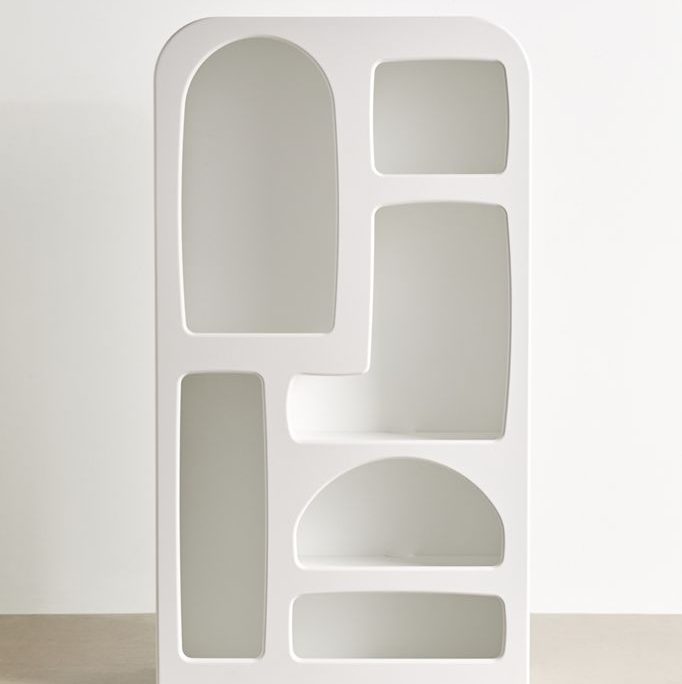 Elsewhere, bright hues meet innovative design in Jumbo’s electric yellow neoprene-upholstered beanbag couch and Studio Mignone’s ombré concrete table. For storage, we can hardly think of a more stylish vessel than Christopher Campbell’s leaning plaster bookshelf (it “says a jaunty hello,” according to the collection description).