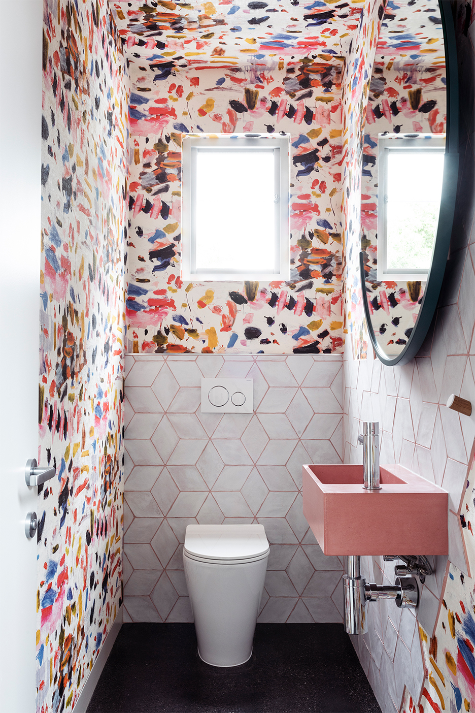No transformation can beat the powder room, though—the walls, ceiling, and even the back of the door are covered in graphic brushstroke wallpaper. Now add pink tile grout, a black-lit mirror, and a rose-toned sink basin. “It was the room that made me (and everyone) the happiest during lockdown,” says Mainland. “For a while my son, Cobalt, couldn’t walk past it without saying, ‘Wow, Mama!’ It really is floor-to-ceiling amazingness.”
