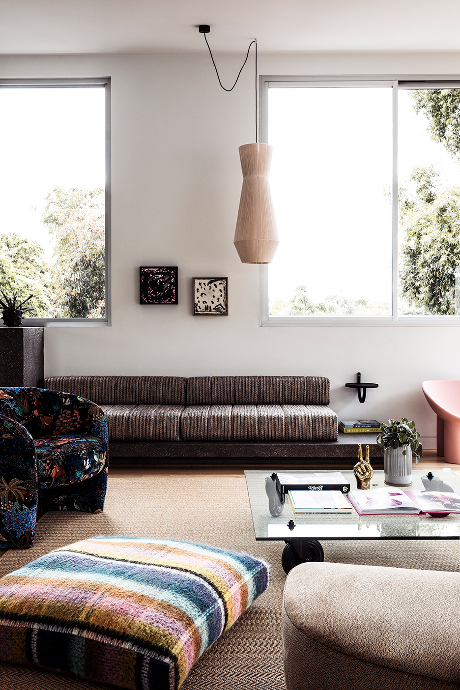 Strauch made the most of the awkward empty nooks under the staircases by filling them with sculptural storage—a rounded rattan console and hand-painted hanging shoe cabinet, respectively. To balance the room’s warehouse-like bones, Haag’s designers doubled down on cozy textures, from a chair upholstered in a rainbow-hued wool, mohair, and alpaca fabric by Pierre Frey to a seagrass floor cushion and lima bean–shaped wood stools. The low-slung silhouettes make for a less structured, modern take on a conversation pit.