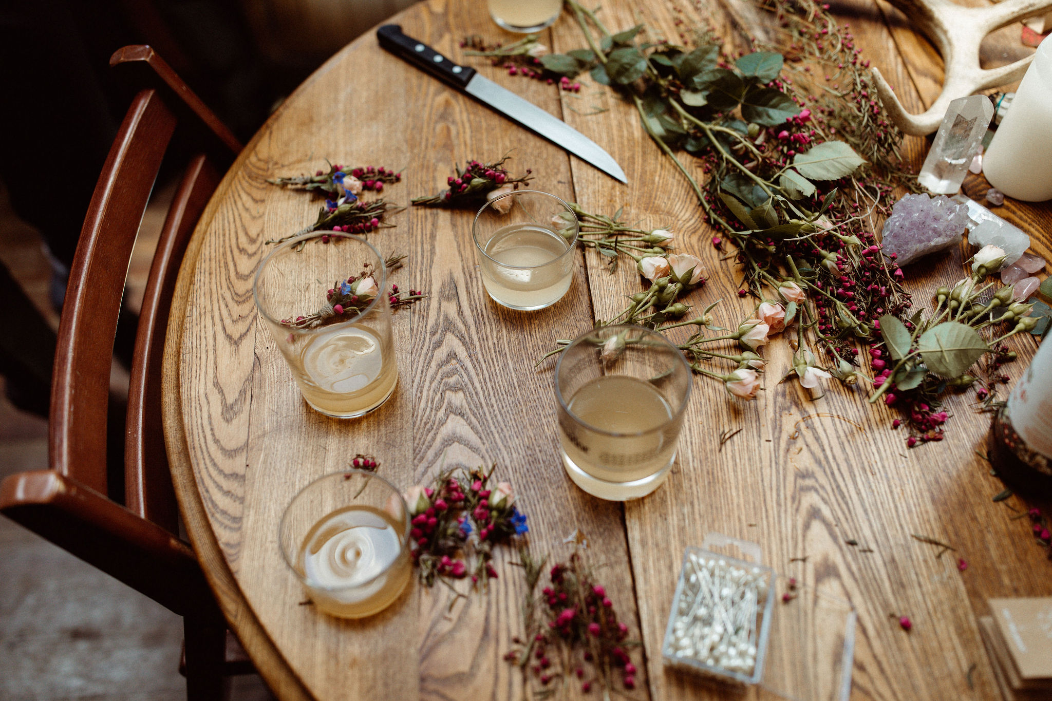 “I didn’t want to spend thousands of dollars on something that I know is going to get thrown away,” Kang explains. The wedding party DIY’d their own bouquets and boutonnieres that morning while everyone got ready. “There’s so much down time,” says Kang. “It’s fun to come together and start cashing in those favors people owe you.”