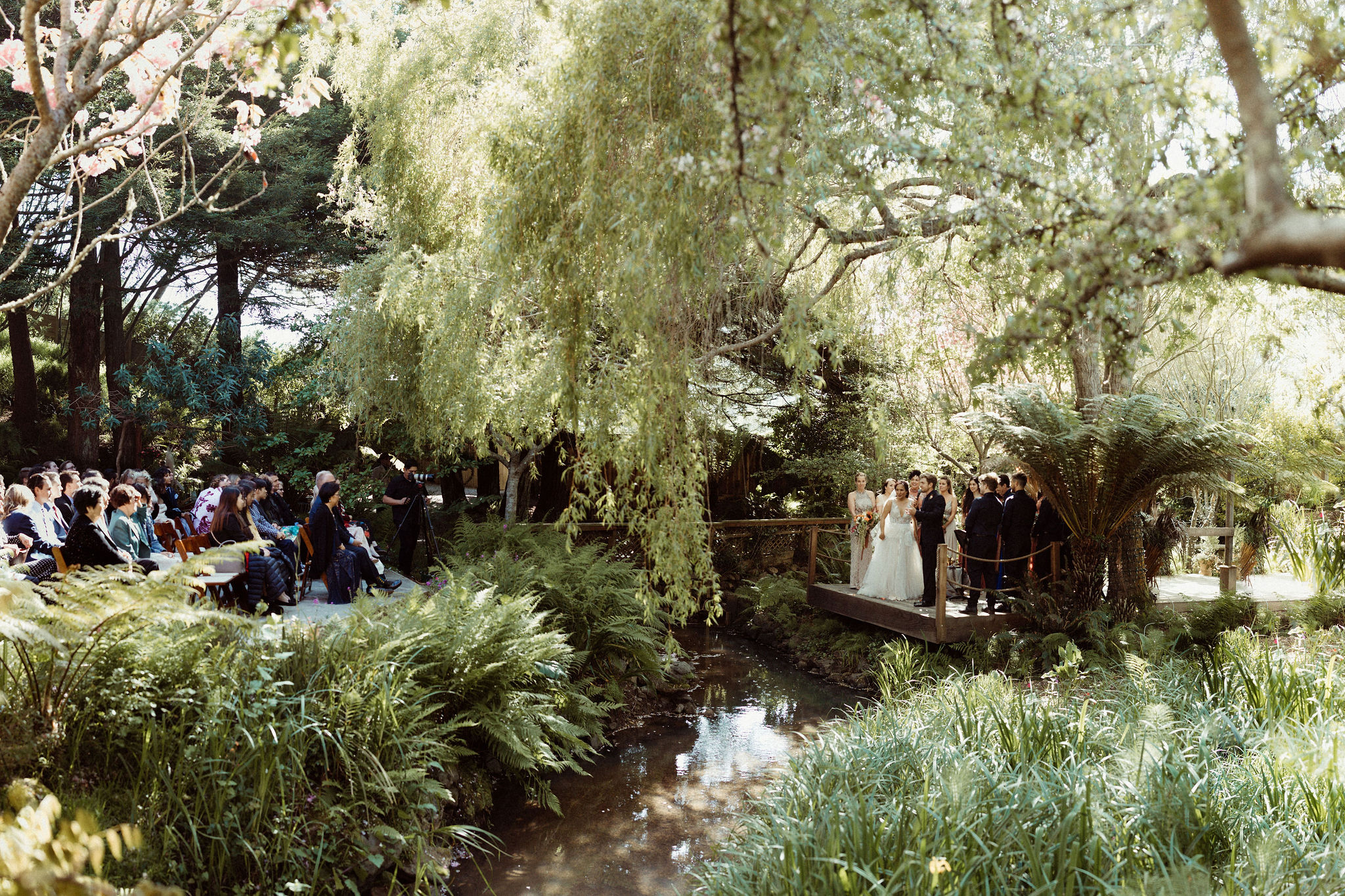 Surrounded by towering redwoods, ferns, and wildflowers, Kang and Brochu couldn’t have picked a more magical setting. The thing was, the couple would be saying “I do” on a wooden platform overlooking a creek, while their guests sat and watched from the other side of the water. Luckily, the wedding party was more than happy to step up to the plate. The small group of friends and family congregated around Kang and Brochu as they walked down a pathway on the other side of the creek. “It felt like we were going to a pep rally and they were our teammates,” she remembers.