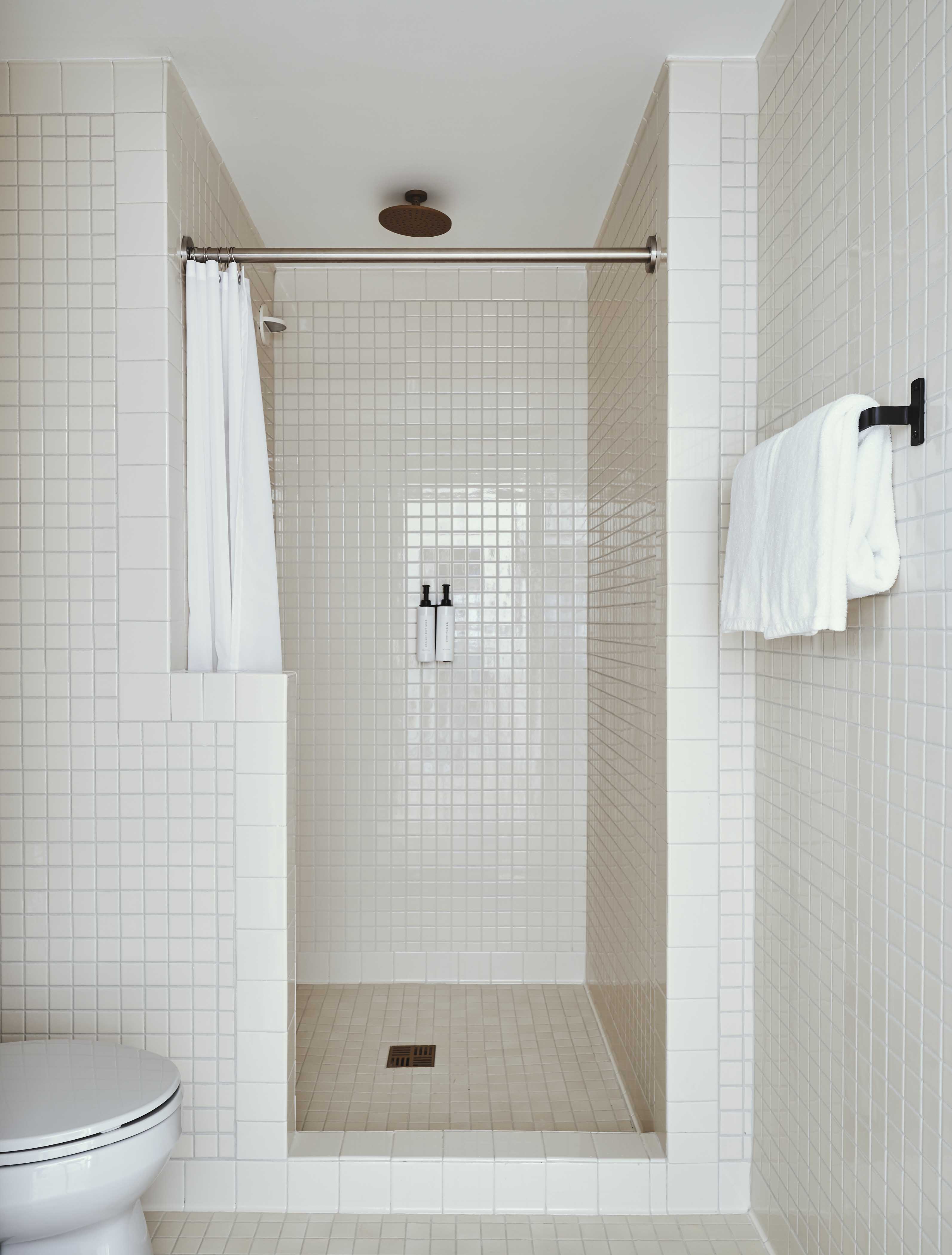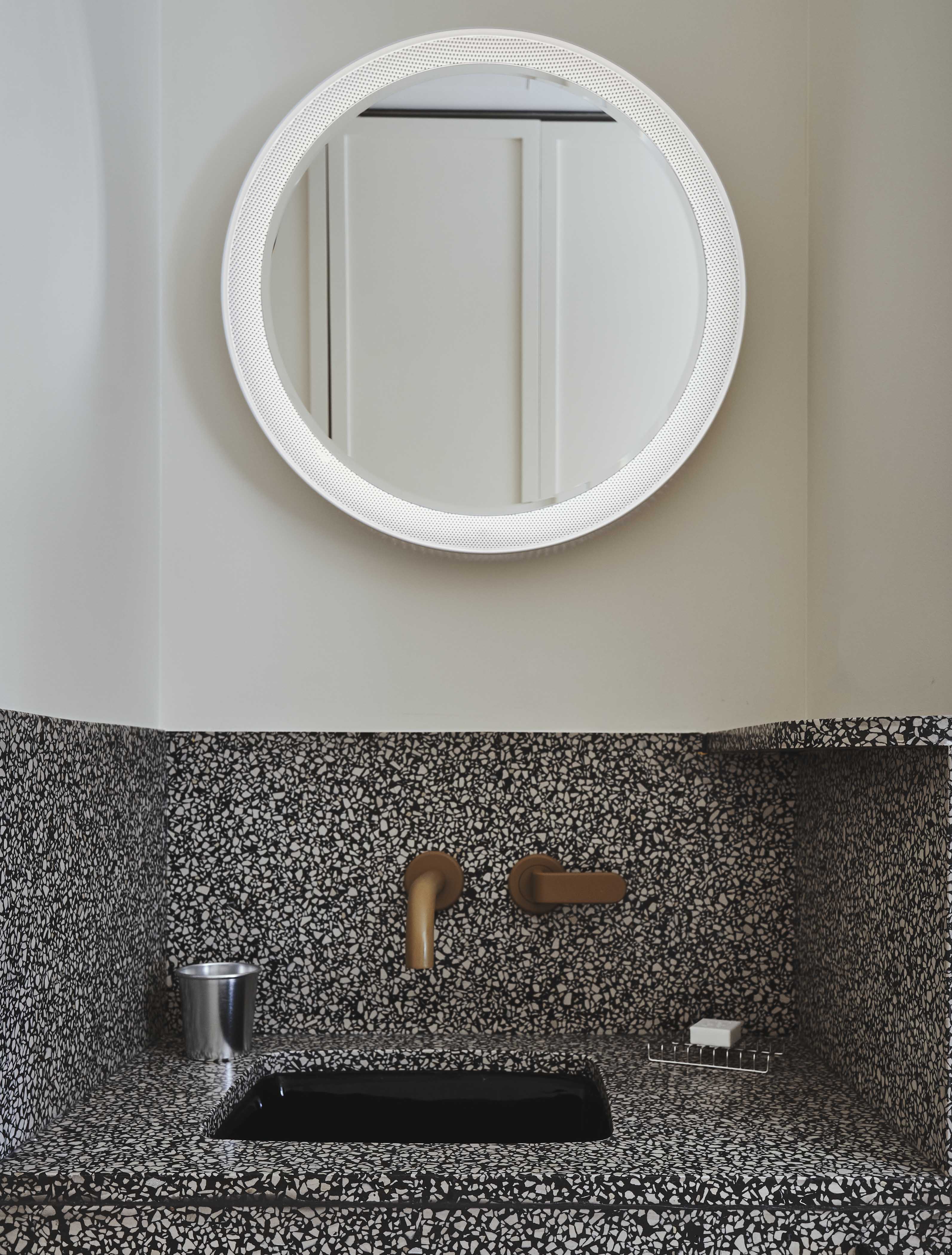 “It’s disturbingly easy to quickly fill a small space,” Sawdon told Domino. “We tried to prioritize what we felt was necessary and strip everything else away. When you do that, you also need to prioritize quality—we focused on materials, simple design, and a few standout pieces like the Noguchi lamps and terrazzo vanities to bring the room together.”