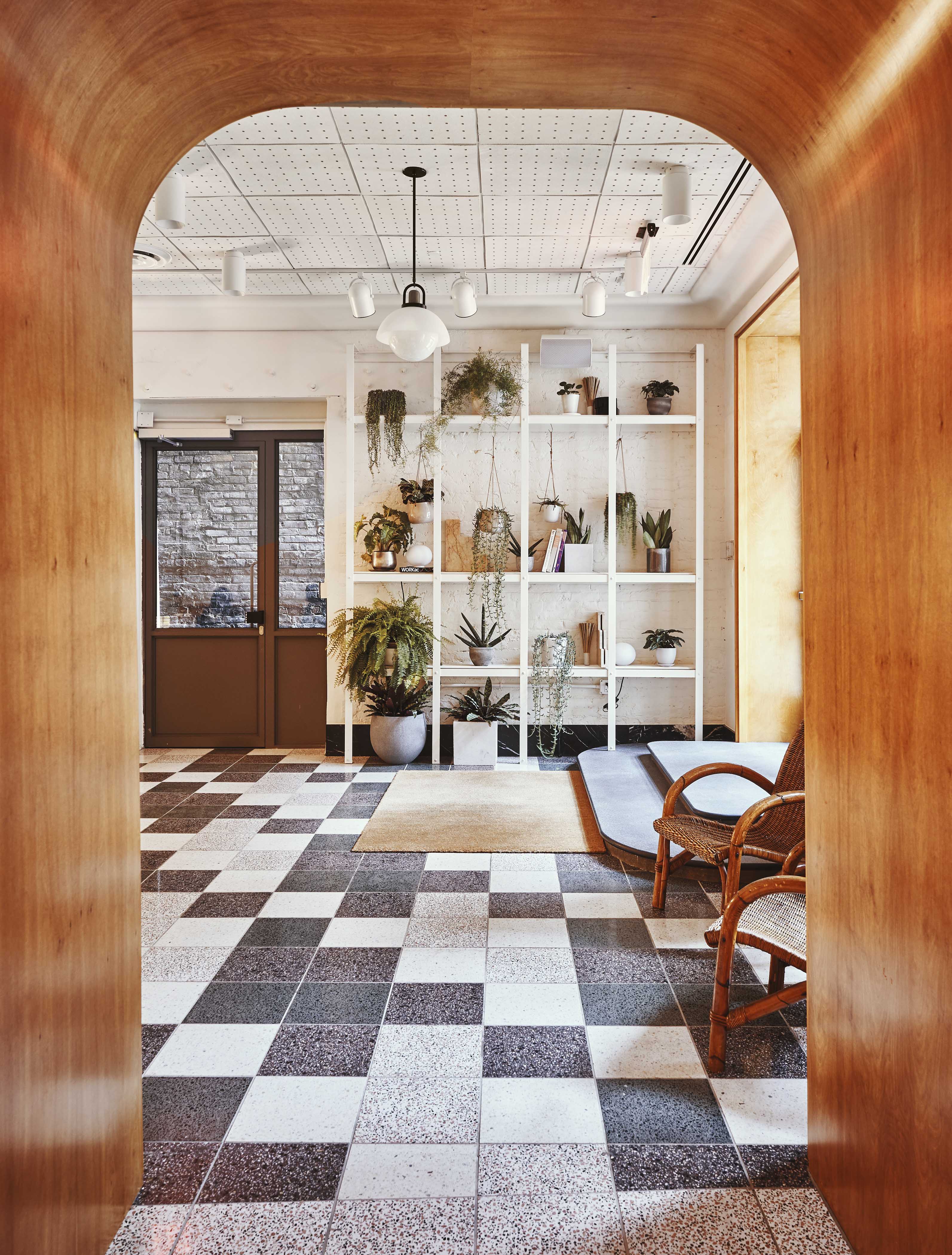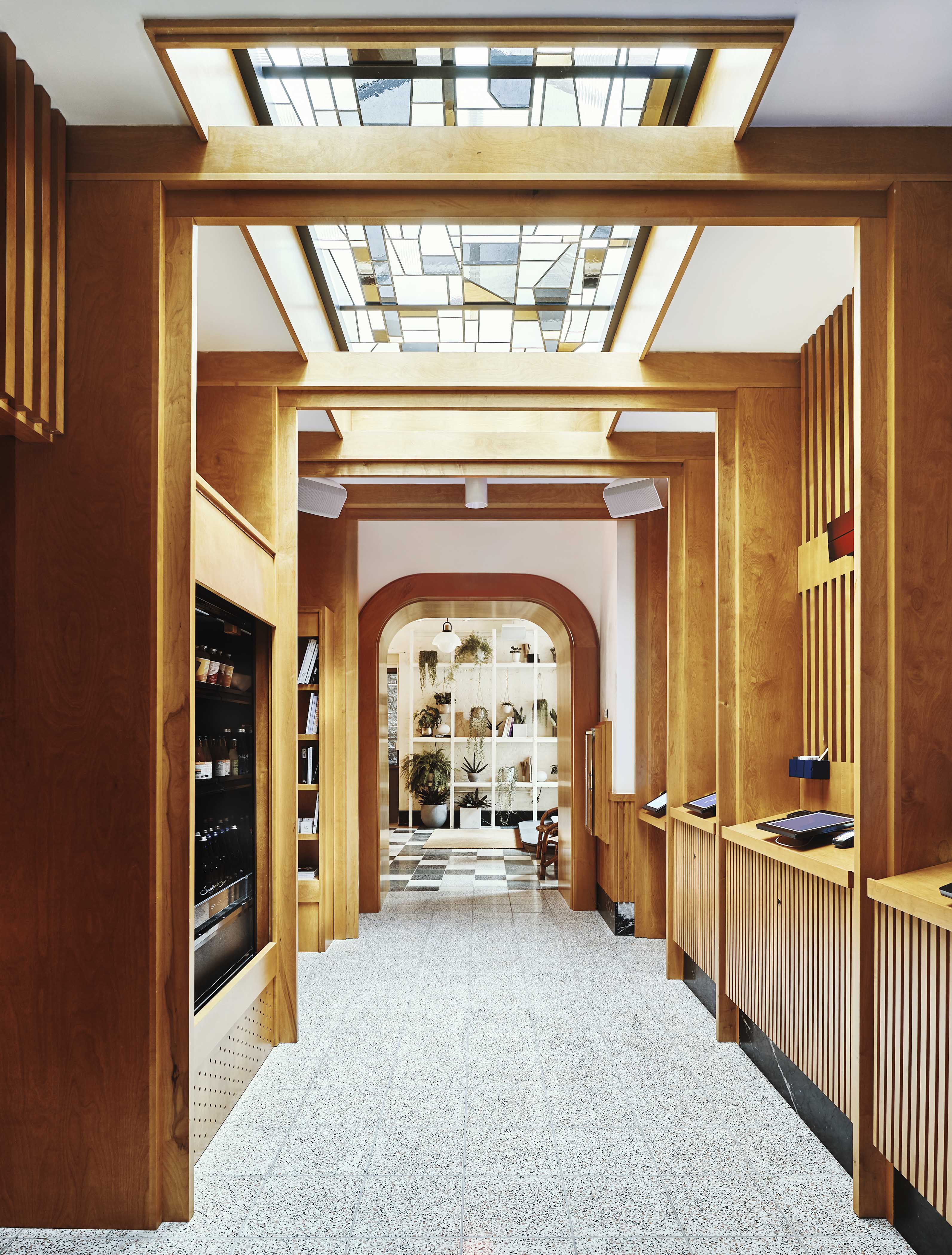 The bookcases in the lobby are filled with plants and books to nourish the soul and mind. The custom stained-glass ceiling in the guest check-in area features nontraditional muted colors and filters the light in a beautifully soft, subtle way. A first-of-its-kind generative lobby score by Julianna Barwick plays in a loop and is inspired by images captured by a sky camera on the roof: passing pigeons, the change in light, cloud formations, a faraway airplane.