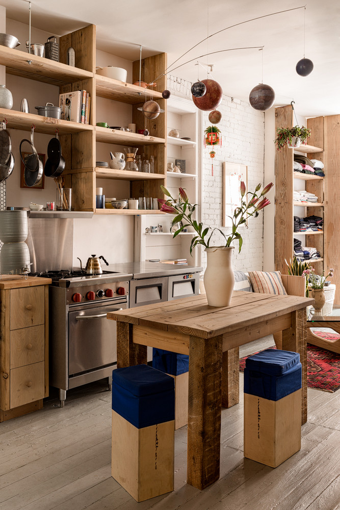 A perfectly sized table was fabricated from salvaged wood beams from the apartment’s original walls.