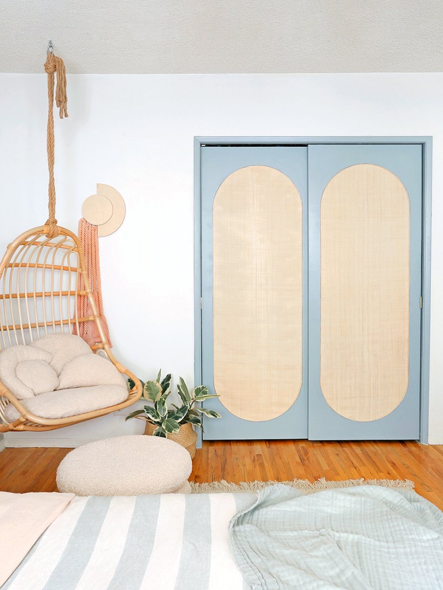 Secure the painted MDF panels with finishing nails or a heavy-duty staple gun. There’s no need to remove the original doors: Keep sliding them around until you can see the whole surface. “It’s nice to have two people doing this,” Moreno notes. “That way, the other person can hold the weight while you hang the material.” If the inner edges of the cutout shape are a little rough, apply a thin strip of basket reading around the trim with hot glue to streamline everything.