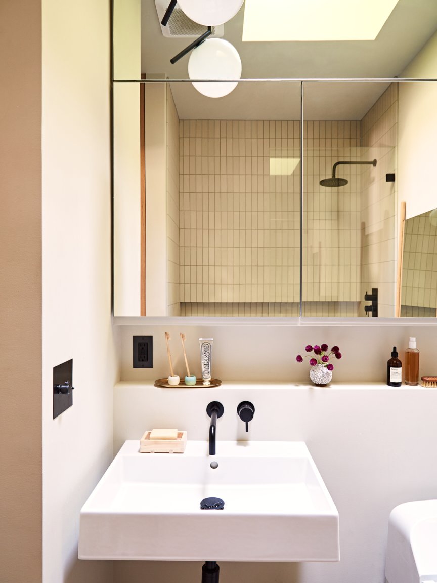 In addition to a sleek medicine cabinet that soars to the ceiling, Yeh and Jenkins incorporated open storage for their most-frequented products, including toothbrushes. Unlike a floating shelving unit, the built-in ledge over the sink blends into the background. And by continuing the same minimal idea into the shower area (peep the niche dotted with soap and shampoo bottles), Yeh created another illusion. “Because the space is so small, adding symmetry helps it feel a little bit bigger,” she notes.