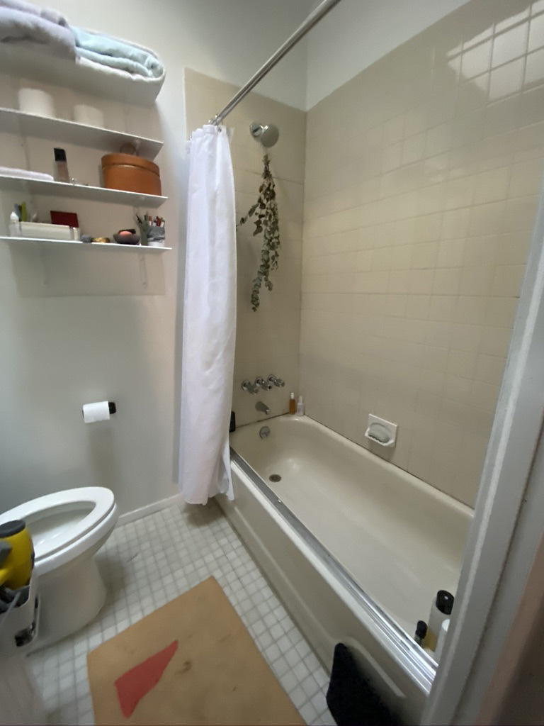 Life was different before Laura Yeh, an art director at Ritual, and her boyfriend, Zach Jenkins, a design lead at luxury furniture brand Hellman-Chang, renovated the bathroom in their 100-year-old Park Slope, Brooklyn, apartment. For starters, the space was so cramped they had to take turns using it. “We could never brush our teeth at the same time; it was really tight,” recalls Yeh. Between its dated tub-shower combo (complete with sliding glass door) and blah-gray wall tiles, she guesses the room hadn’t been majorly updated since the building had been converted into a co-op in the 1970s. Another annoyance: They didn’t have an in-unit washer and dryer, so the couple had to haul their dirty clothes to a laundromat. “It was not fun carrying laundry up and down four flights of stairs,” she says, laughing.