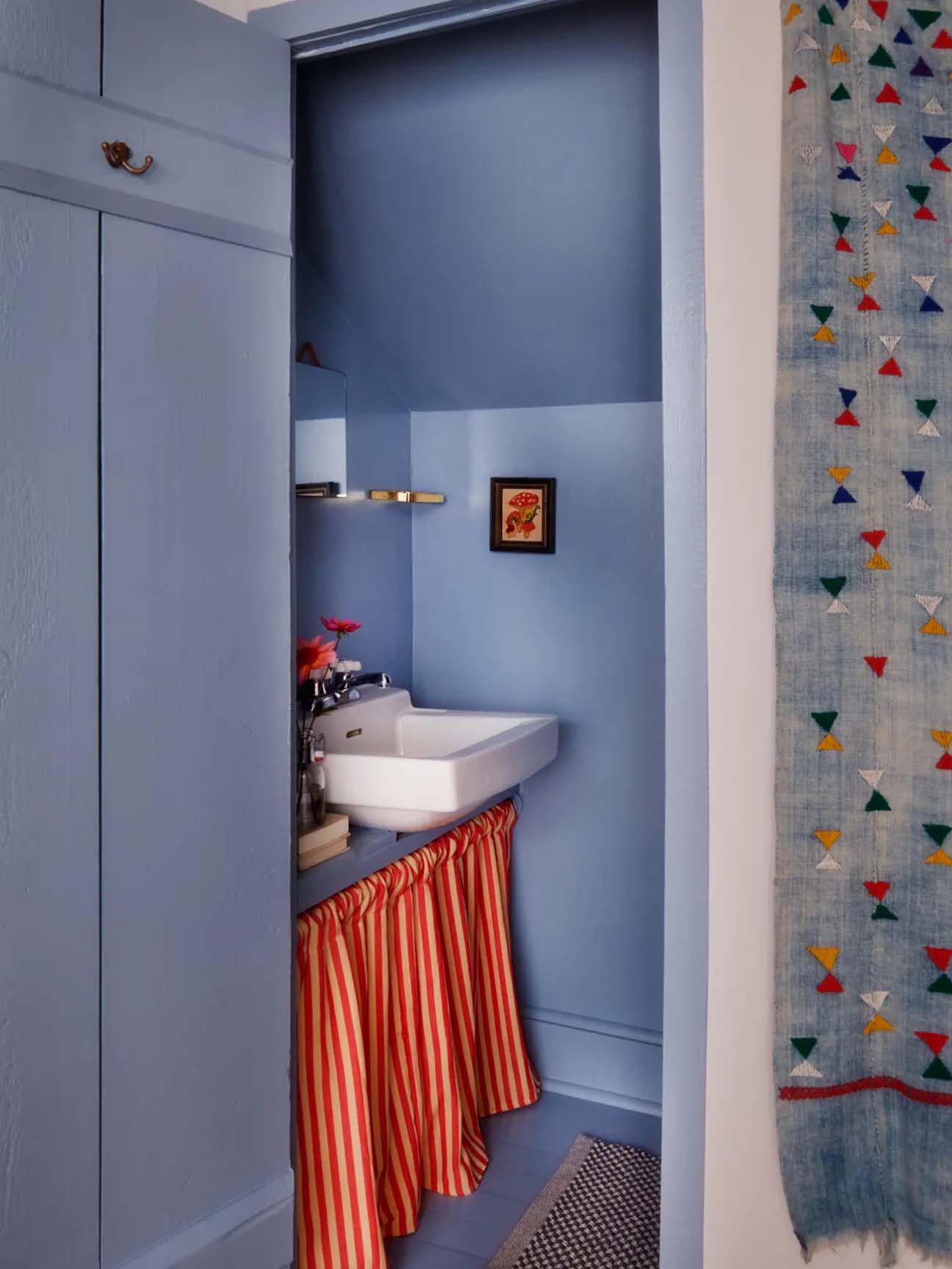 Your own, that is, not that of the ceiling. “I totally overlooked how every aspect I chose for the vanity added extra height, and I’m only 5 feet 1!” says Molly Madfis, whose bright and breezy bathroom is an inspiration to tight spaces everywhere. She ended up cutting about three inches off the legs and lowering the faucets. “Everything turned out okay, but I’m not going to lie—it sent me into legit panic mode,” she notes.