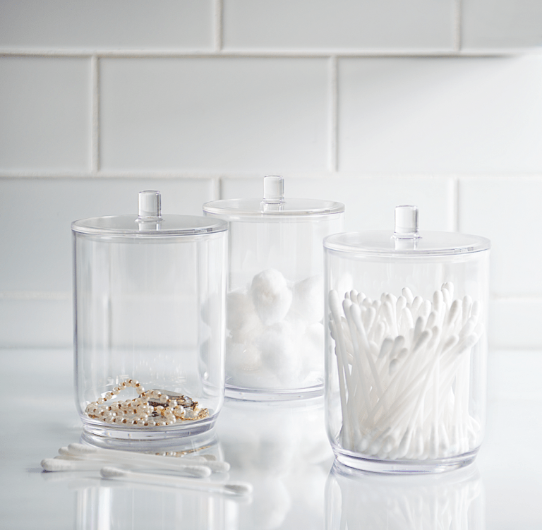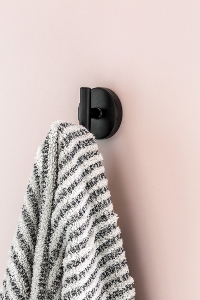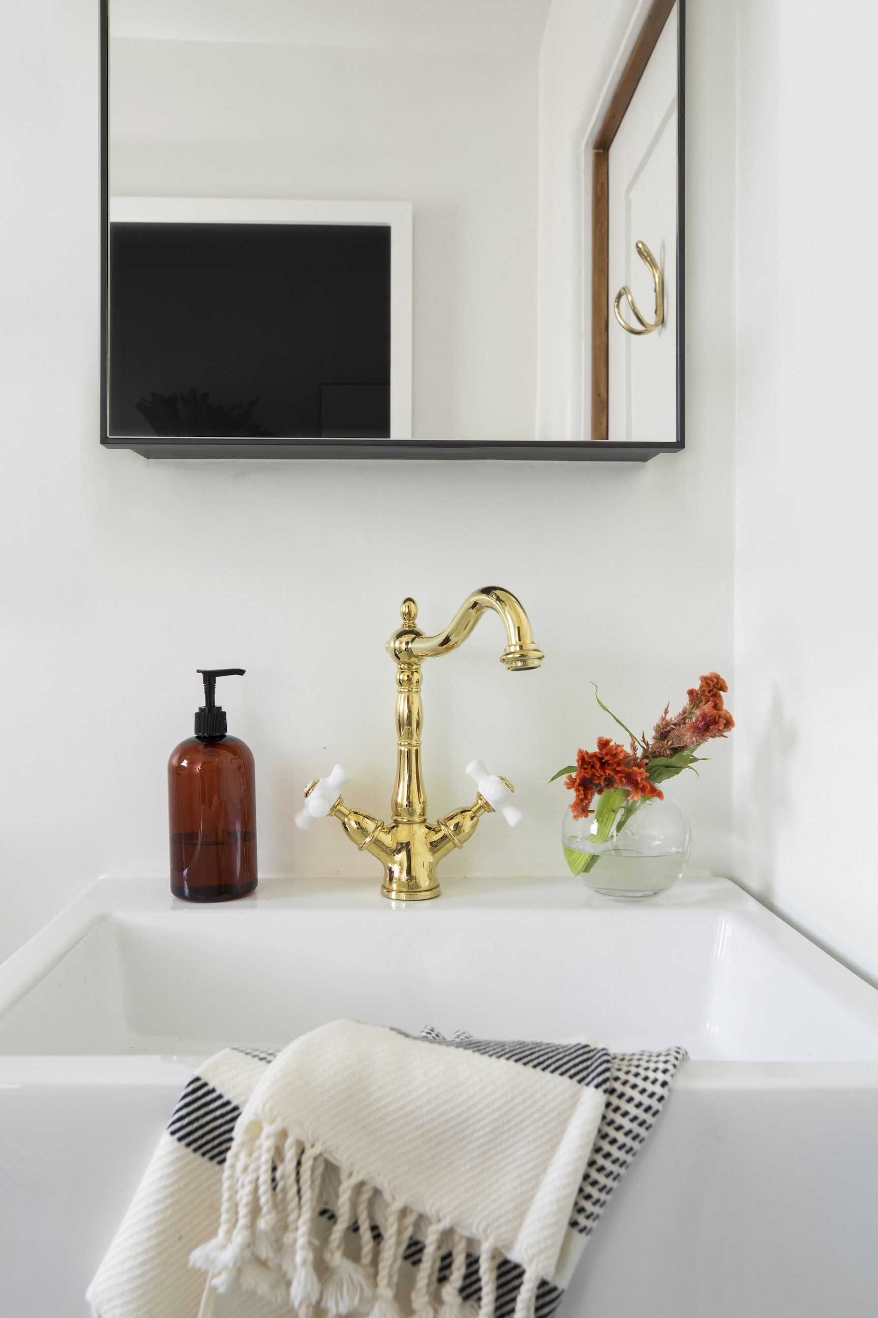 Discovery: “In my hunt for inspiration, I uncovered my building’s distinct design influence,” says Sanders. “The 1925 Monterey-style building combines French, English, and Andalusian roots, so I kept Colonial, Mediterranean, and Middle Eastern details in mind throughout the entire process.” Even the most essential of bathroom accessories reflect his eclectic influences—from the modern apothecary jars, swing-top trash can, and Turkish-style towels to the natural sea sponge and low wood stool, Sanders gravitated toward small items that make the bathroom, despite its size, feel more luxurious.