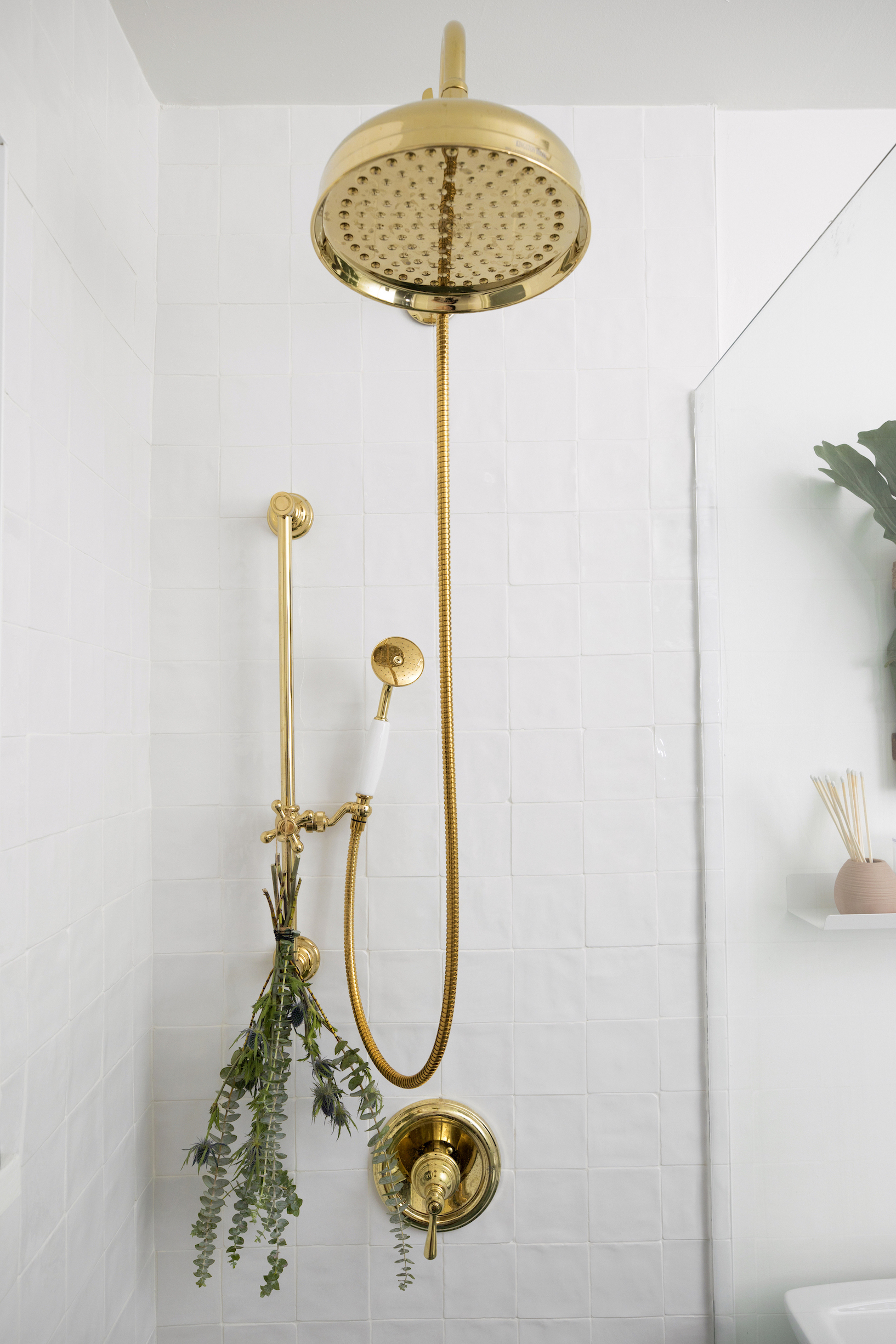Flow: Sanders’s biggest goal was to improve the function of the 5-by-7 space. With better flow a top priority, he rearranged the floor plan, swapping the tub for a shower and moving the sink to the same wall as the toilet. White walls open up and brighten the room, while flooding the area with greenery, like hanging eucalyptus on the shower head and scattered plants throughout, accentuates the tiled floor. A vintage soap tray, a bowl of palo santo, and a vase of thistle rest inside the built-in shelf. “The result is an experience that’s easy to travel through, wrapped in style that looks so good you don’t mind leaving the door open,” he says.