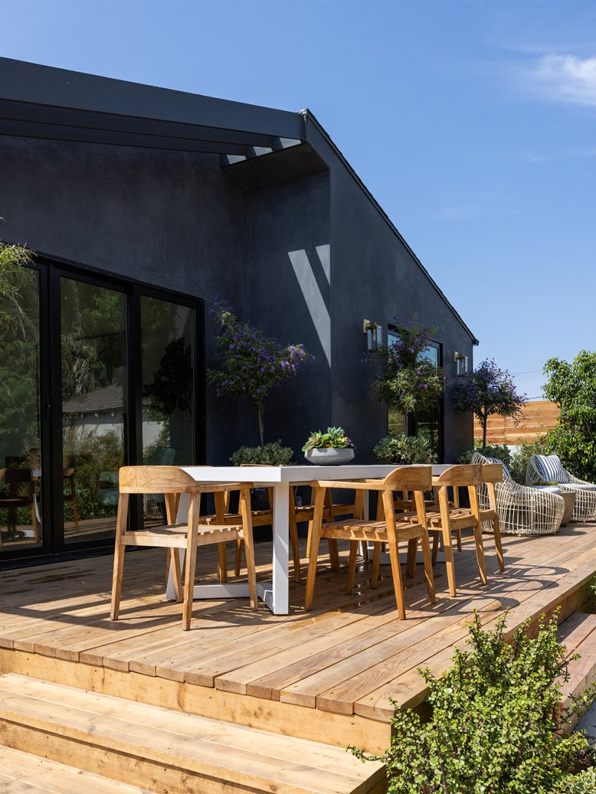 A streamlined deck and subtle roof jut-out gave the backyard much-needed dimension, while doors connecting the area to the main bedroom and family room embody that outdoor-indoor Cali lifestyle. Baer painted the existing cinder-block barrier and then added wood on top for extra privacy. “It’s a little oasis in the city now,” he says.