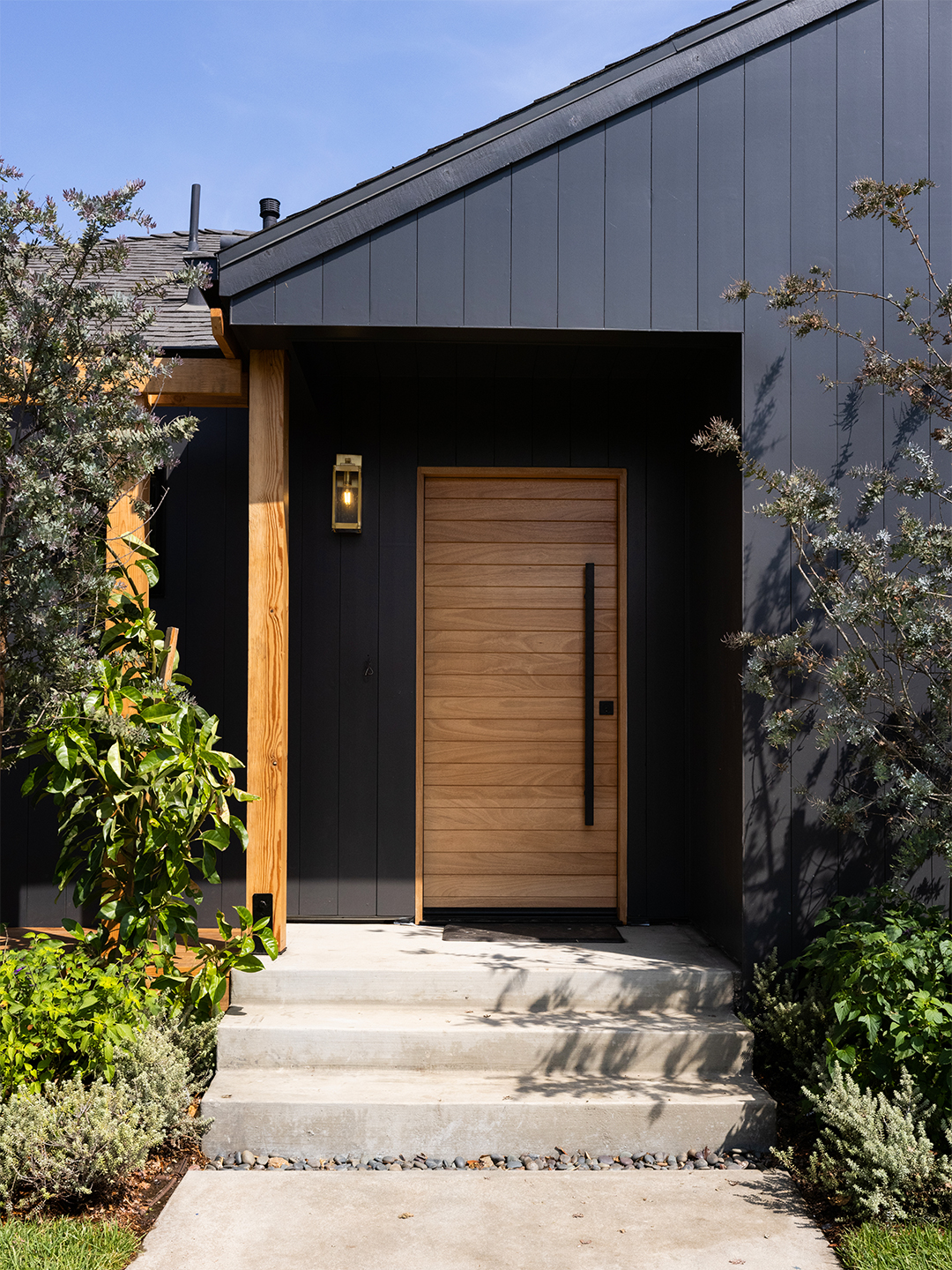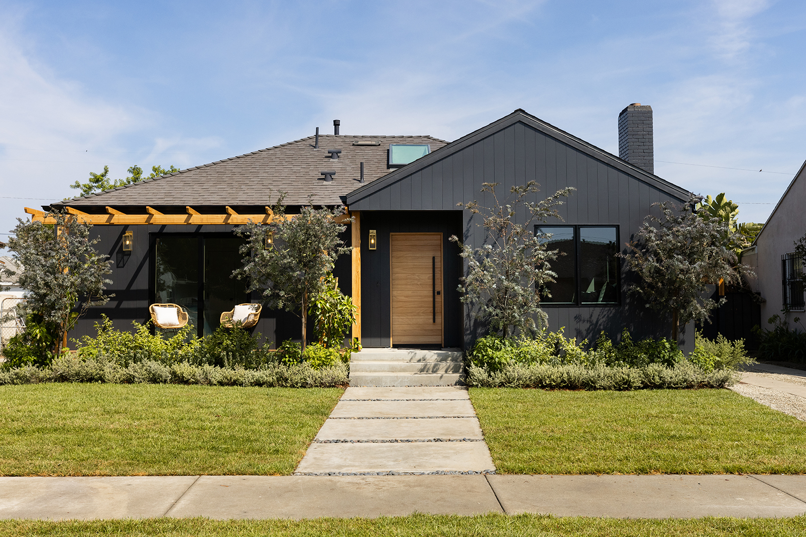 Shain’s simple explanation for going black: “White was just overdone,” says the designer, who swathed the facade in Benjamin Moore’s Wrought Iron hue—a balanced, muted black that infuses the exterior with a touch of Scandi farmhouse. The dramatic choice helps the predominantly drought-tolerant landscaping, wood fence, and pergola details stand out. “It’s not so monolithic,” says Shain. “There are all these natural elements and tones.”