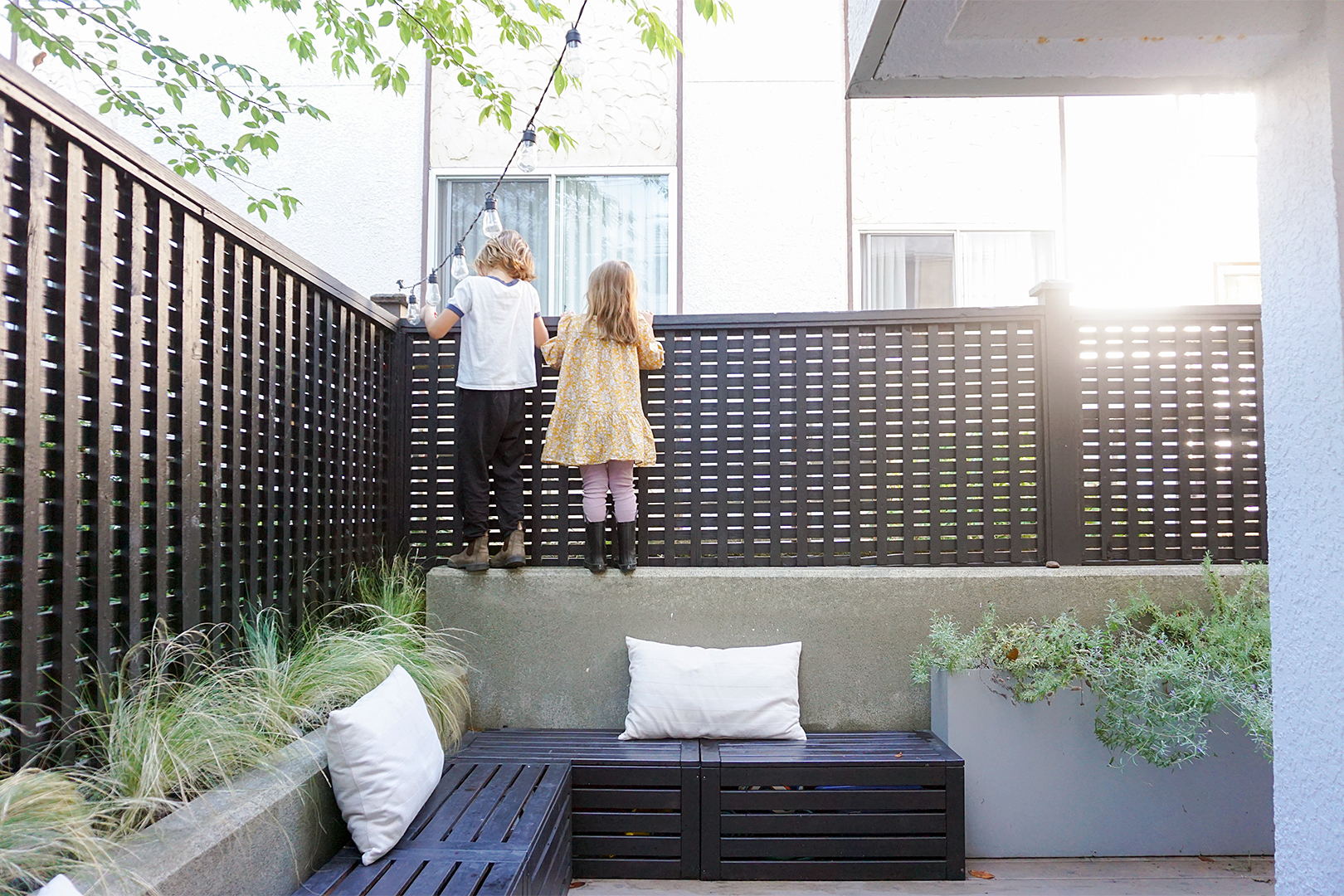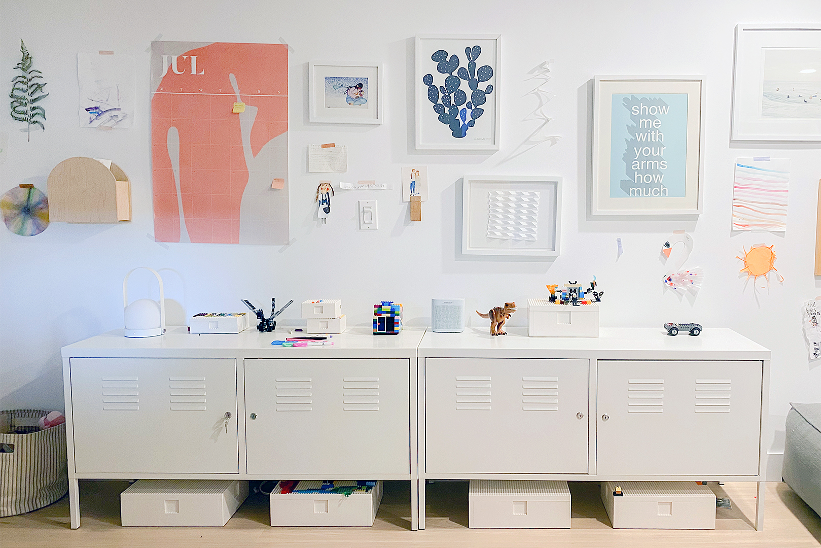 For the time being, Alison is giving Theo and Mae a sense of independence by designating certain areas in their room where they can display and store their things. For instance, one bin under the bed is for him, the other for her, and the third is for shared art stuff. “And it’s their responsibility to take care of the things in those containers,” she says. All plastic outdoor toys and beach gear live outside on the patio underneath a built-in bench created out of plain wood IKEA Applaro benches (she just cut the legs off and stained them black). “We have this nice, relaxing area, but you don’t realize there’s all these water guns underneath it,” she adds.