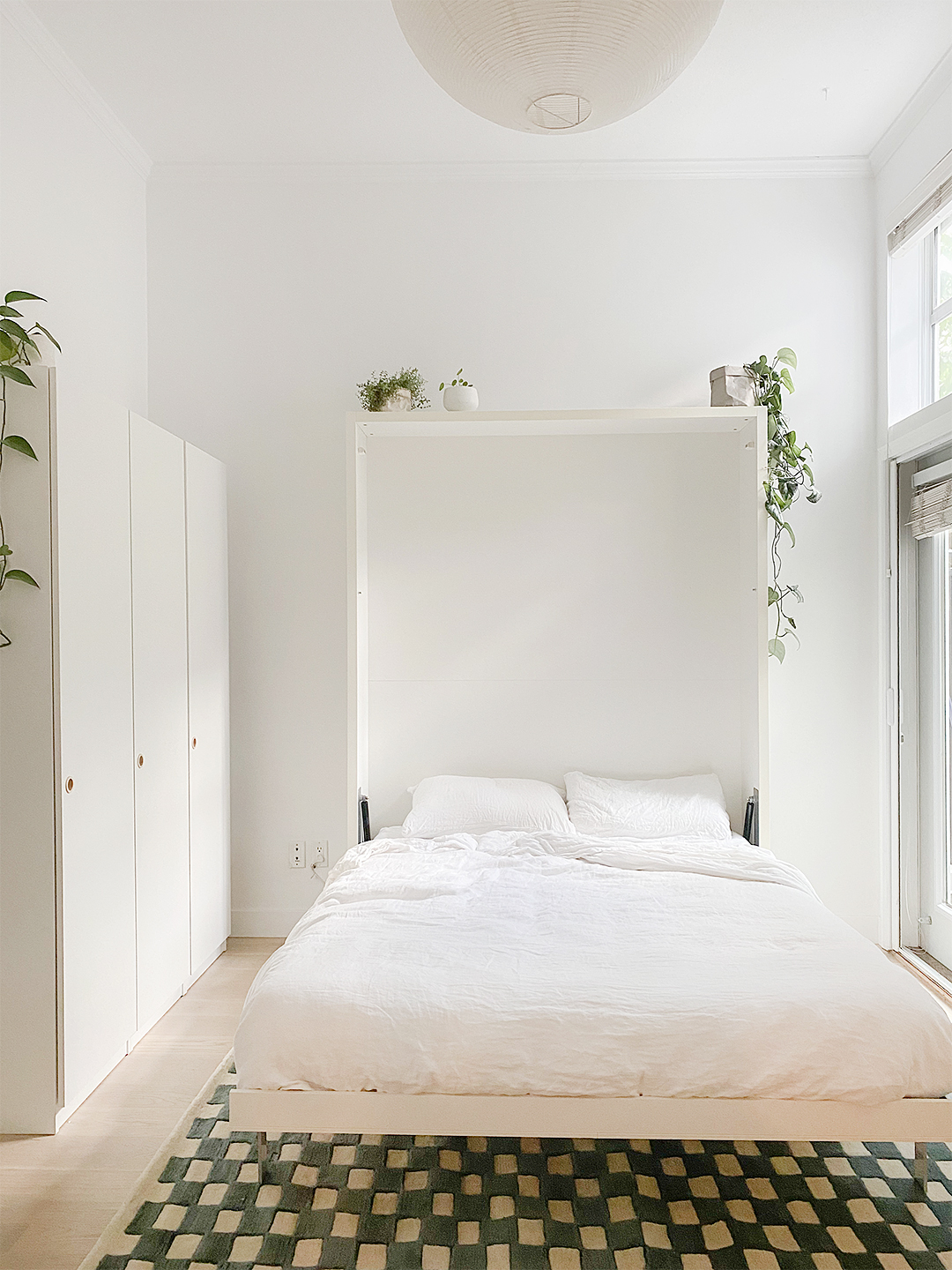 The shallow IKEA Pax closet in the couple’s sleeping space acts as a catchall for miscellaneous household items (it holds linens, cleaning supplies, and bathroom product overflow), while everyone’s clothes are stowed in a walk-in closet just outside of the kids’ bedroom. All four of them also share the bathroom. “It requires a lot of communication, like: ‘I’m having a shower; does anyone need to use the bathroom first?’” explains Alison.