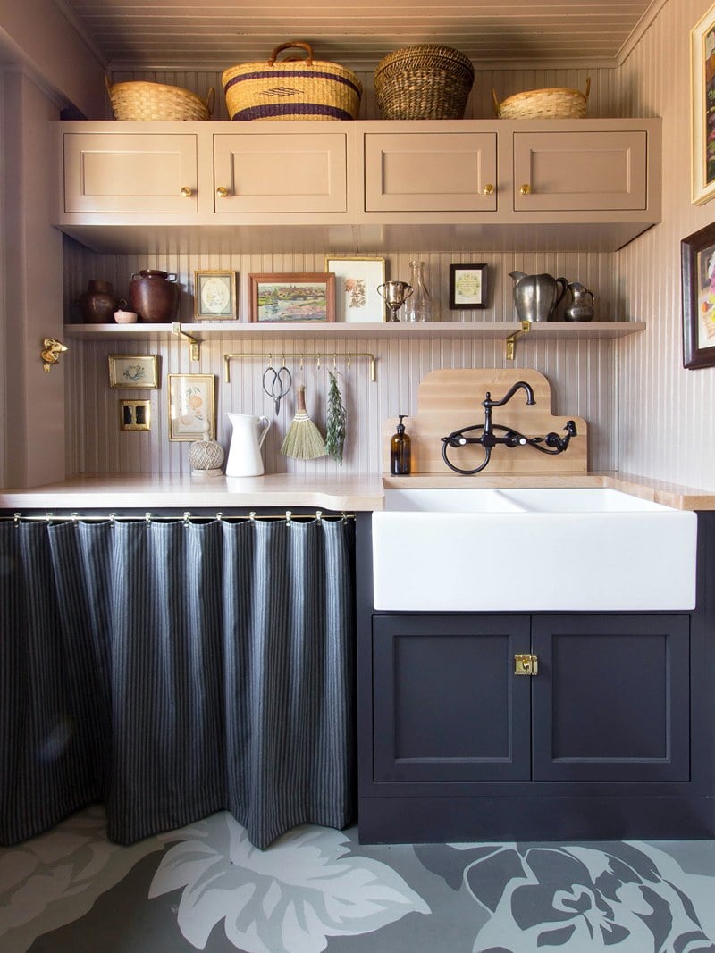 Most important, don’t shy away from customizing your cabinet configuration—possibilities are endless, even in a rental. This kitchenette gets a lot of jobs done in its tiny footprint. A curtain replaces under-counter cabinet doors for easy access and an unexpected texture that softens an otherwise wood-heavy build-out. Open shelving offers a place to infuse your personal style with small vignettes, while keeping cooking essentials hidden in closed storage with subtle hardware. Lastly, woven baskets atop the uppers infuse rustic charm while doubling as organized storage—our kind of multitasking.