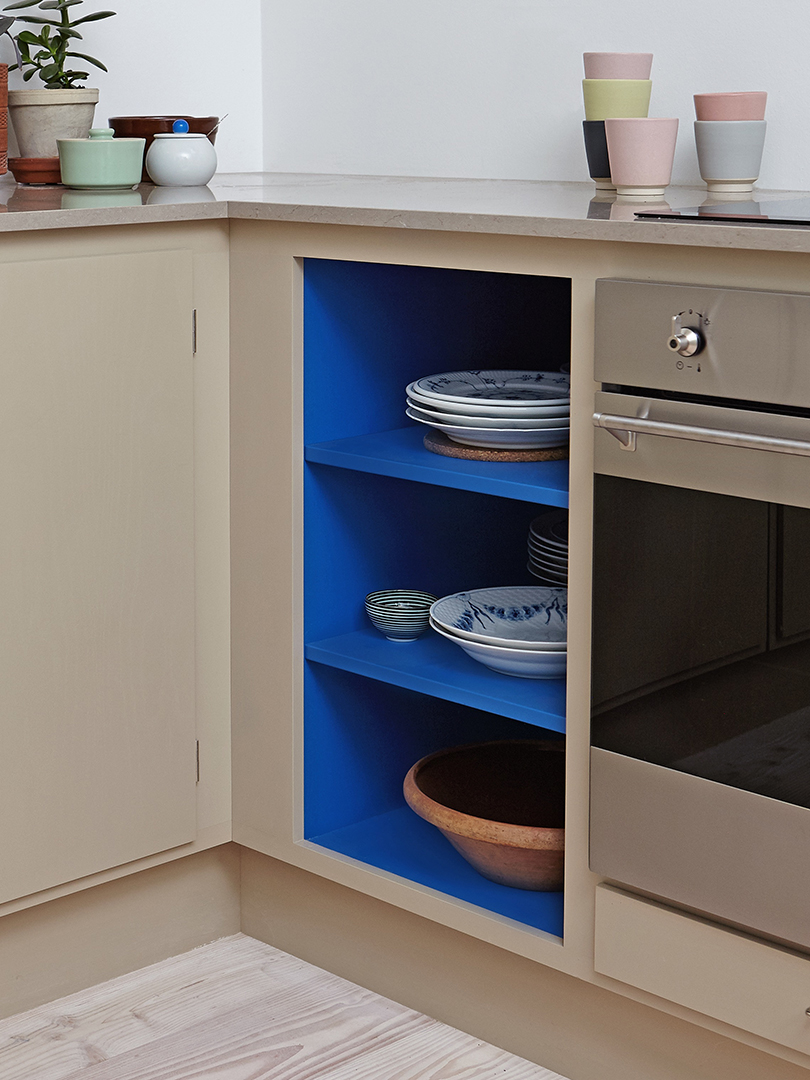 In a tight corner, cabinet doors quickly become a hindrance with panels and their hardware knocking into one another and, frankly, getting in the way. Try removing a cabinet door or two to open up your space and create some DIY open shelving. Paint the inside for a pop of personality. (This further grounds the move as an intentional design decision.) We love how this electric blue open cupboard contrasts with its tonal beige cabinetry by Stilleben Architects. Bonus points if your statement color nods to another focal point in your kitchen, like a backsplash, favorite vase, or wall clock.