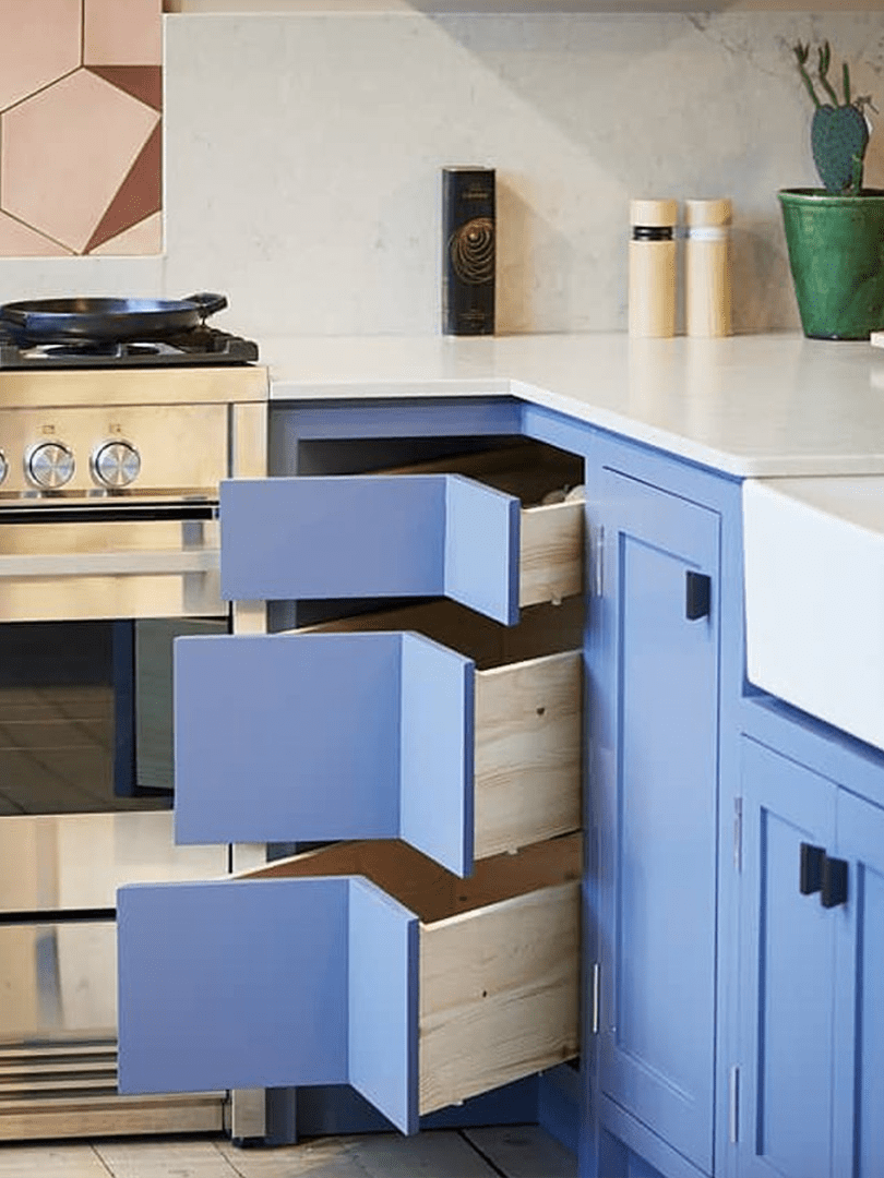 Less clunky than their corner cabinet counterpart—which often results in far-back space that’s hard to see and reach—corner drawers make an awkward area more accessible and usable. Pairing ergonomic efficiency with aesthetics, corner drawers help streamline a tight space and make for a hardworking L-shaped workstation. Go sans hardware and opt for push-to-open drawer slides to create an even cleaner look, and add organizing containers or partitions inside to keep things neat and clutter-free.
