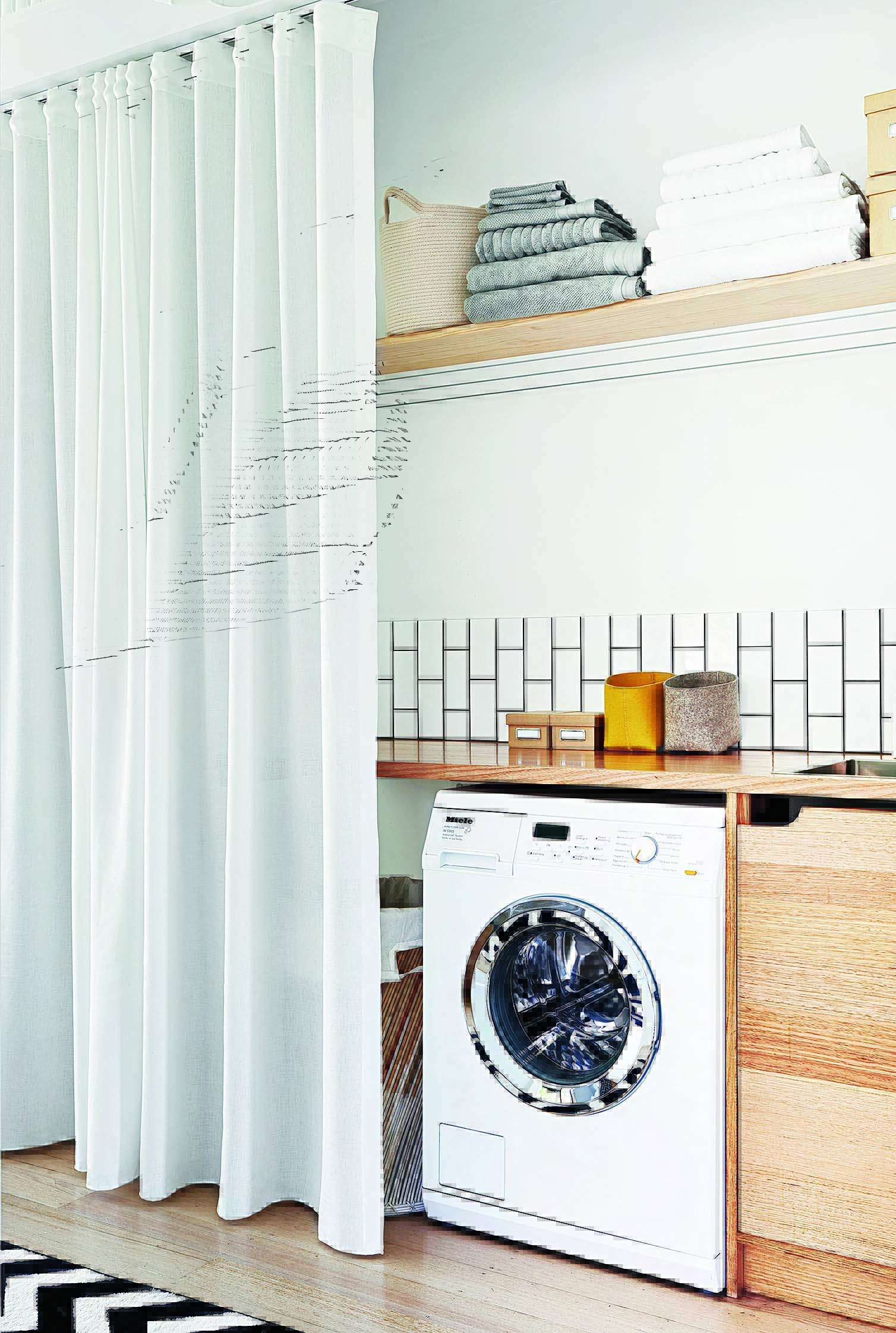 If your only option is to do your laundry in your living room, consider cleverly disguising the area with a simple white curtain. Designer Lena Bruno suspended a swath of fabric from a ceiling track in this West Footscray, Australia, house so that when guests come over, smelly gym gear won’t be the topic of conversation.