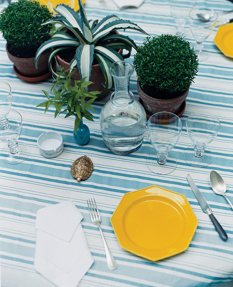 Position two large water pitchers near the table’s center, and install a sort of diminutive salt and pepper shakers set-up at each end.