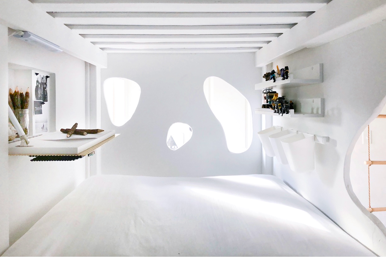 The real star of the 10-by-12-foot room, though, is the triple bunk bed, featuring a plaster outer shell with free-form cutouts that’s accessed by a climbing wall. Inside, each boy has his own little world, thanks to clever storage compartments that allow them to stash Lego collections, books, toys, mementos, and other treasures. “You get to hang out with your brothers and you don’t really get scared because you’re always together,” says Roman. “I love that it doesn’t separate you from the rest of the family,” adds Aidian.