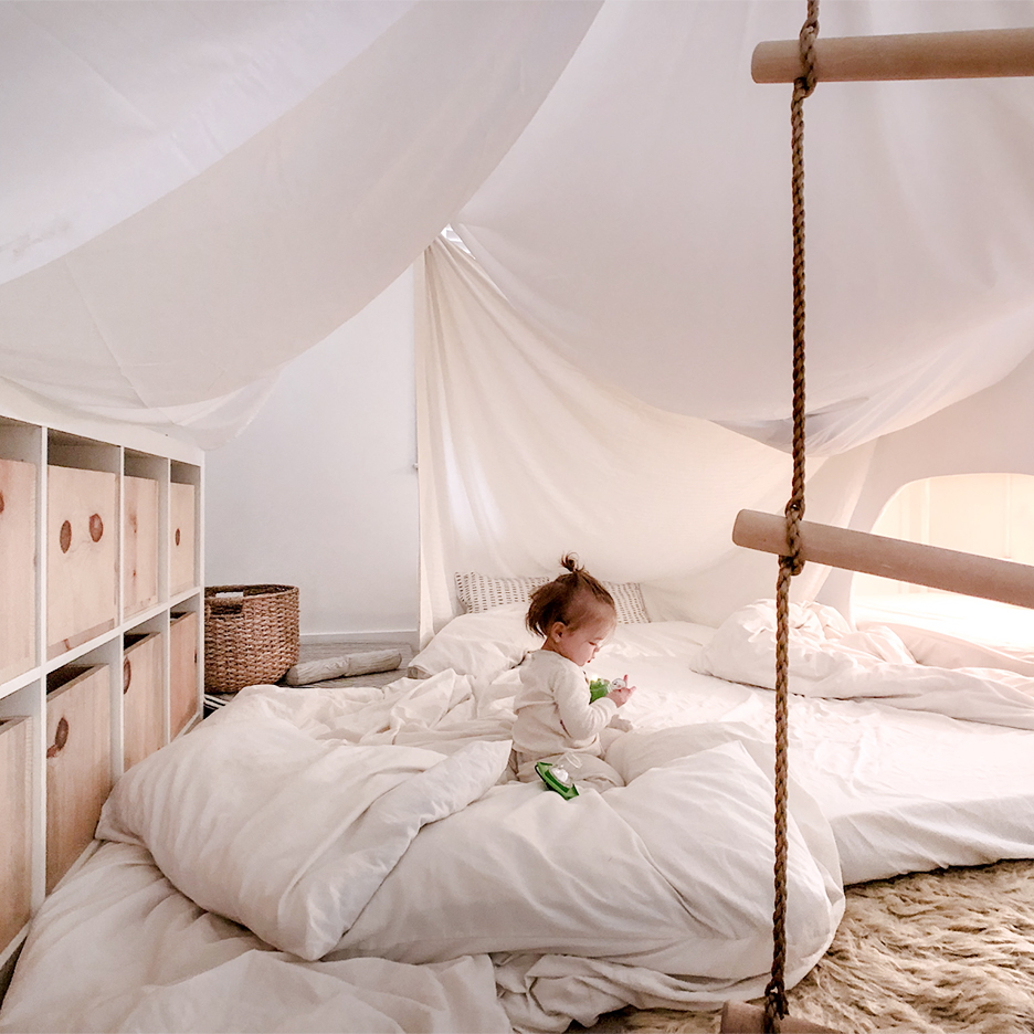 Making a shared space appeal to kids spanning almost a decade apart in age could be a stretch, but the Graveses were game to tackle the project. “Our main focus has been to make the design fun and bring in elements of play,” explains Karla. That translated to a knotted climbing tree, rope swings, a library wall, and enough floor space left over for lounging on beanbags, building forts, racing toy cars, and more.