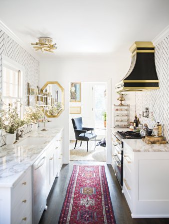 White marble countertops, backsplash, and a tiled range hood keep GP’s kitchen looking clean and bright. And we love the shiny chrome finishes.