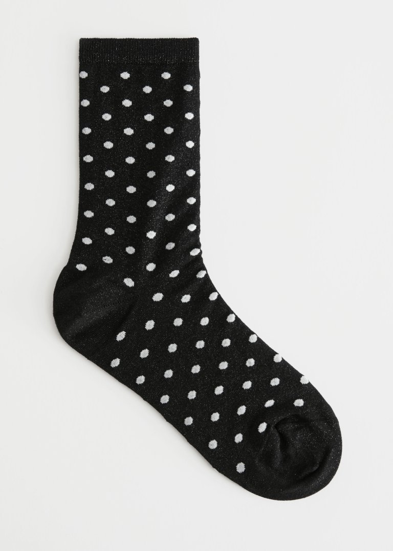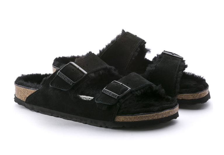 There’s nothing chicer than an all-black look. You can’t go wrong with a classic pair of Birkenstocks with an extra-cozy shearling lining. Grab glitter polka dot socks for an added flair.