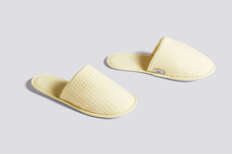 Who says waffles are just for breakfast? Hay’s citrus-colored slippers will make you feel as if you’re walking on a cloud. Just add Technicolor socks and you’ll light up any room you stroll into, even if you’re the only one there.
