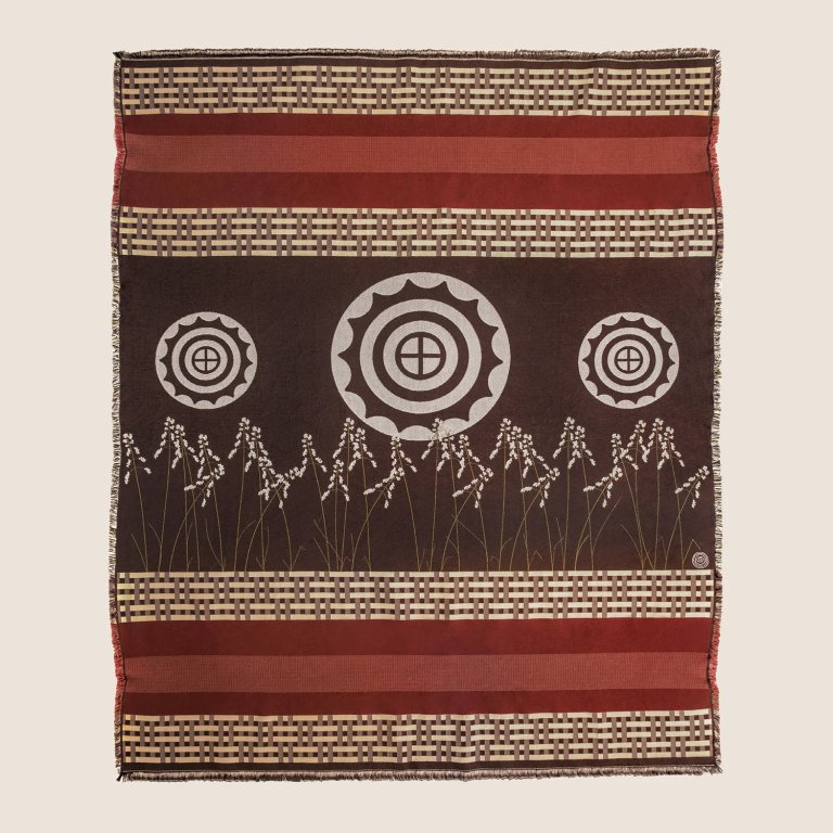 Fashion designer Keren Craig went heavy on texture for the sofa in her reimagined farmhouse in upstate New York, loading up the backrests with a shiny tasseled Moroccan handira (known as a wedding blanket). An embroidered burgundy textile gives the celebratory pieces a down-to-earth spin. Cabin vibes but with a little glitz.