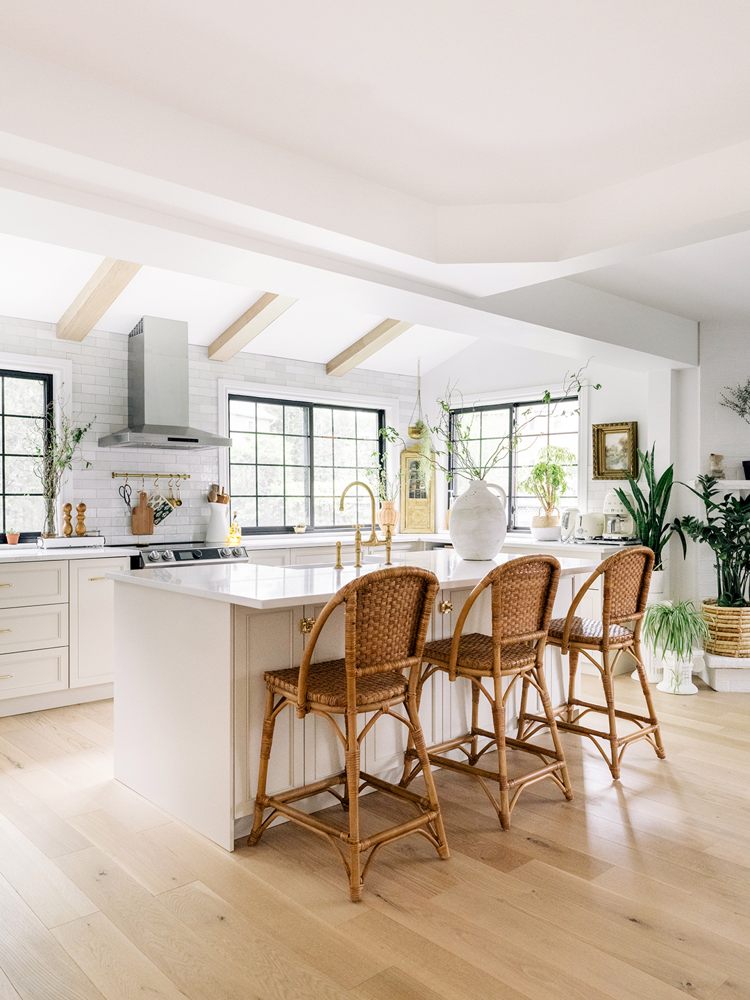 The solarium, with its beautiful pitched roof, was the room that convinced us to put an offer on this house to begin with. We were debating between [accenting it by] adding skylights or solid beams, but both options would have cost a pretty penny, plus my contractor brought up a great point: How would we do lighting? Sconces are trendy right now, but I knew I needed overhead lighting to cook, so we decided to cleverly hide the wiring by creating hollow boxes wrapped in the same engineered hardwood we used for the floors.