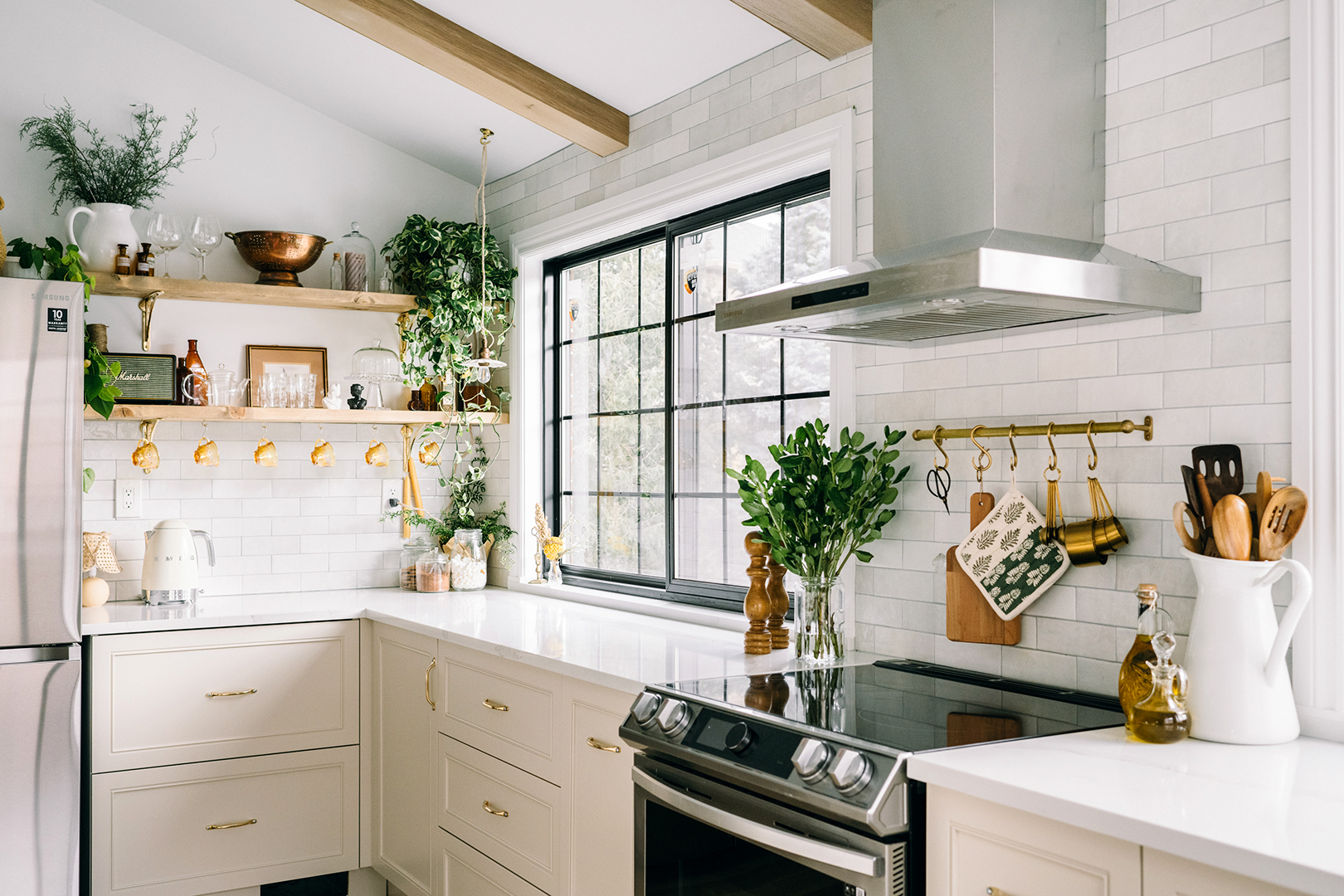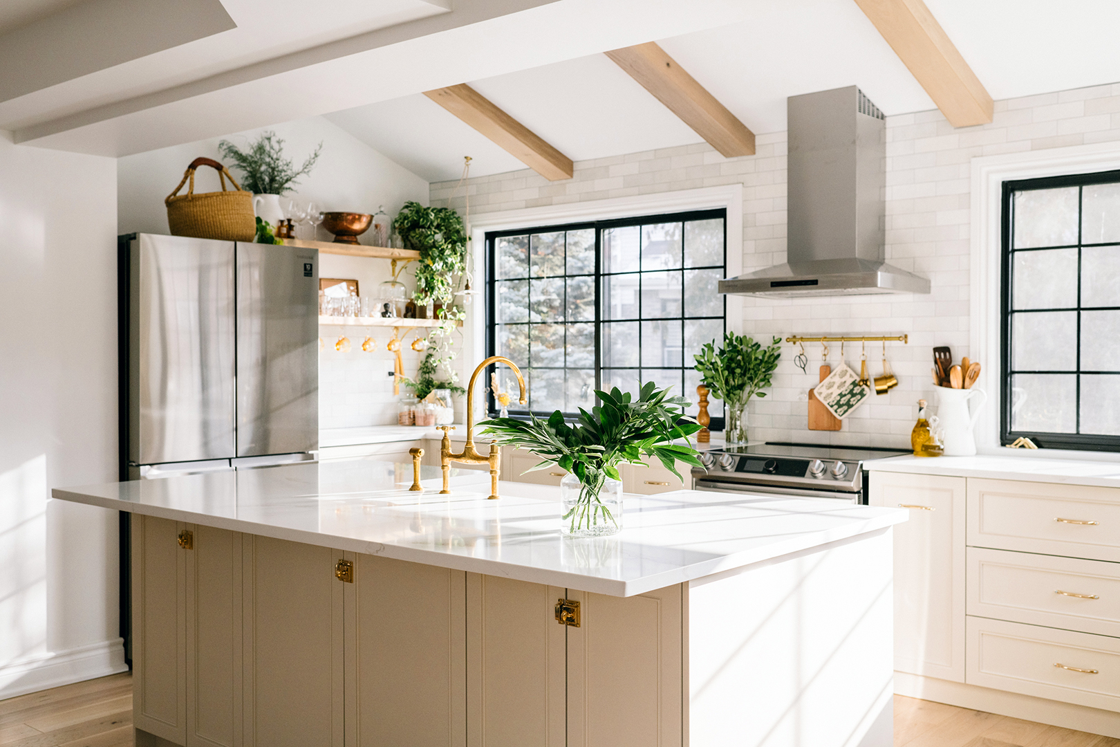 “The cabinetry didn’t make sense [where it was]. In fact, in my opinion, it was dangerous to walk into,” recalls Wendy. The former cooking zone was a tight squeeze and pretty much inaccessible for her father, who is in a wheelchair, and other family members who need walking assistance. Once the couple got the green light to build out a new space and tear out the old one, they started work on designing the new cabinets using IKEA’s rendering tool, stocked up on wish-list brass hardware from DeVol, added faux ceiling beams with a super-functional purpose, and more. The whole project totaled $62,045 CAD, which is pretty on par with a remodel of that scale in a city with a high cost of living. (Psst: You can peep the full budget breakdown here.) Ahead, in her own words, Wendy takes us through the great and the gritty of the reno.