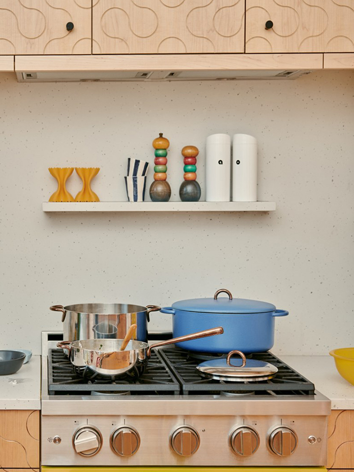 Andee Hess’s serpentine space is like a game of Tetris, where the bumps and grooves (really, the handles) in the white oak cupboards are the puzzle pieces. One upside of solid wood cabinetry is that the edges can be curved, unlike pointy laminate, making it an ideal choice if you are going for a no-hardware look.