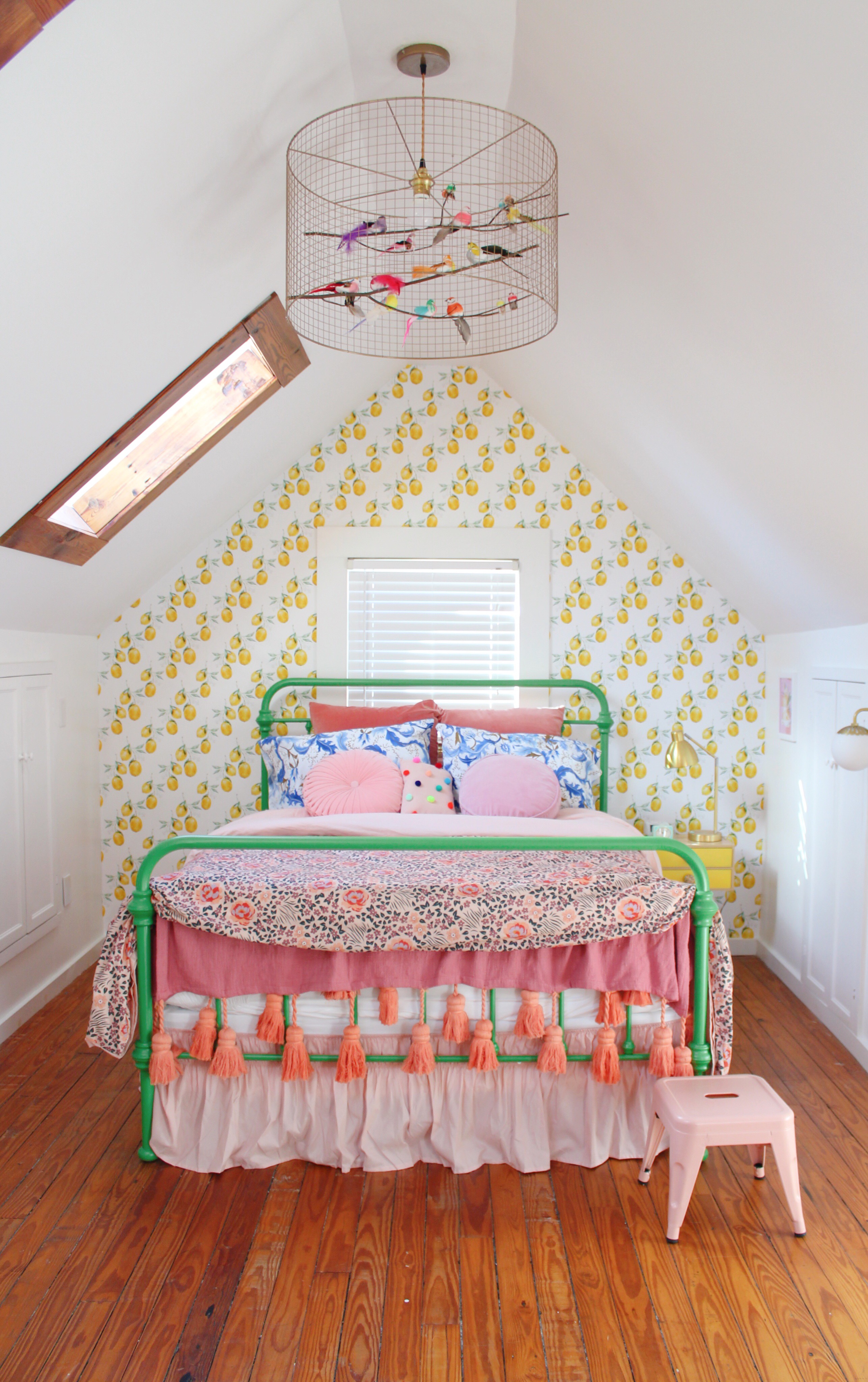 When I first bought the house, I obsessively stalked Pinterest for dreamy bedroom ideas. I came across Gray Benko, who had the most amazing lemon wallpaper in her child’s bedroom and immediately knew I wanted a fun accent wall for the lofted space. Wallpaper is one of those things that can be a little bit tricky to buy online because you can’t see/nuzzle/touch/view it in person. With that being said, my lemon wallpaper accent wall has made all my bedroom dreams come true.