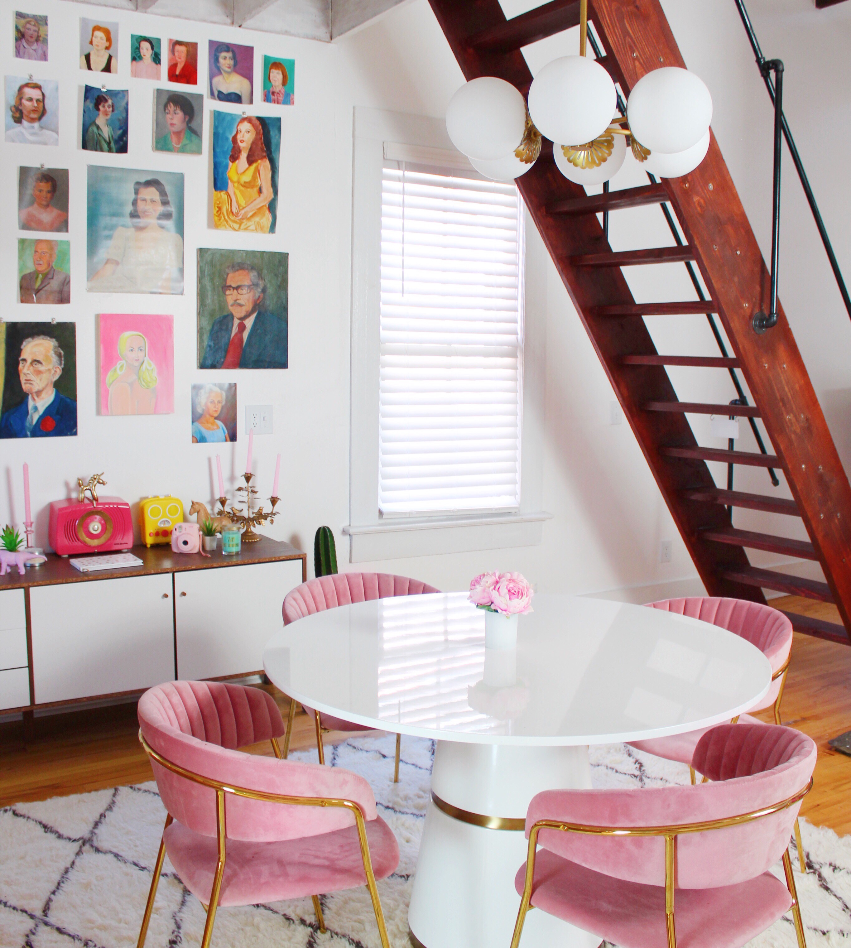 I’ve always been a huge fan of portraits. I remember walking into a Ralph Lauren store when I was younger and seeing a huge staircase filled with antique portraits—a memory that always stuck with me. So I started collecting portraits here and there. Entertaining is always fun, so why not create a space where you’re never alone? No matter if you’re eating dinner at the table by yourself or have five girlfriends with you, you’ll always have a party with the fun folks on the wall.