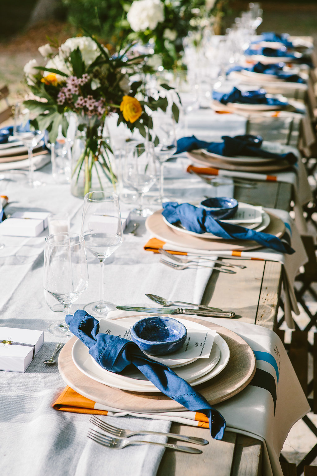 We wanted a casual, coastal, cool setup for the al fresco dinner under the trees. We worked with Ooh! Events and pulled farm tables, dishes in gray/blue hues, and antique flatware.