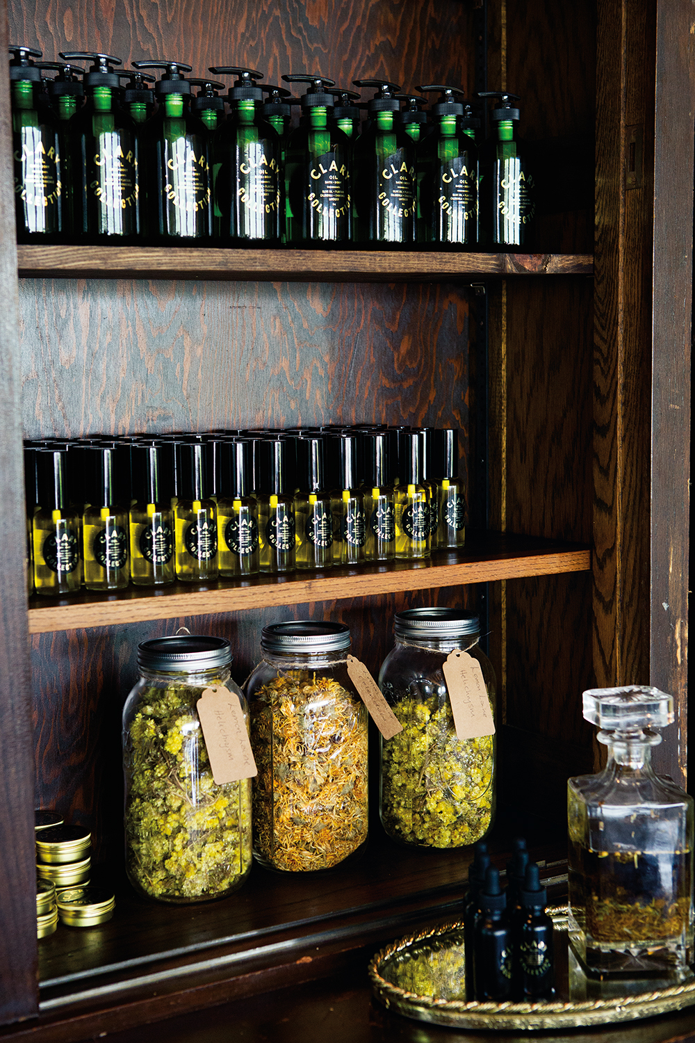 But it wasn’t long before she envisioned her own use for the space: as a sunlit production facility for Clary Collection, the botanical skin-care line that she founded with her friend, Adriel Denae. Out went the Harleys for long-term display at a local museum; in came the century-old apothecary cabinets and jars of dried calendula flowers.