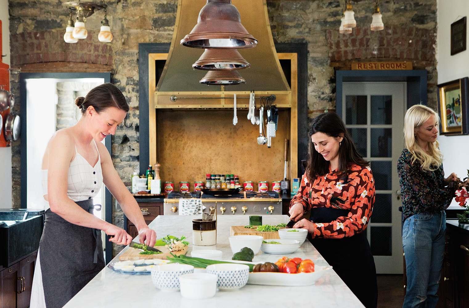 That’s what happened on a recent evening, the weather balmy enough to open the barn’s garage-style doors to the nearby lilac trees. Julia Sullivan, the chef behind nearby restaurant and oyster bar Henrietta Red, had organized a panel the previous day featuring women in food. She and Julia Sherman—whose Brooklyn-based website, Salad for President, spawned a recent cookbook—conspired to join forces for a Southern-themed dinner party at Auerbach’s.