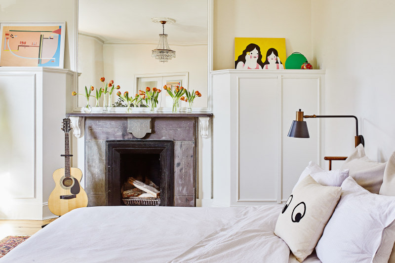It’s not unusual anymore for at least one person in a relationship to work from home, but it’s still a tricky balance to navigate, especially when you don’t have a spare room to turn into an office. So carve out a corner in your bedroom with a desk that takes up little floor space, like CB2’s wall-mounted version. The trick to pulling off this double-duty room, as we learned from New York City–based blogger Heather Summers, is to keep the rest of the decor (lighting, bedding) neutral and fuss-free.