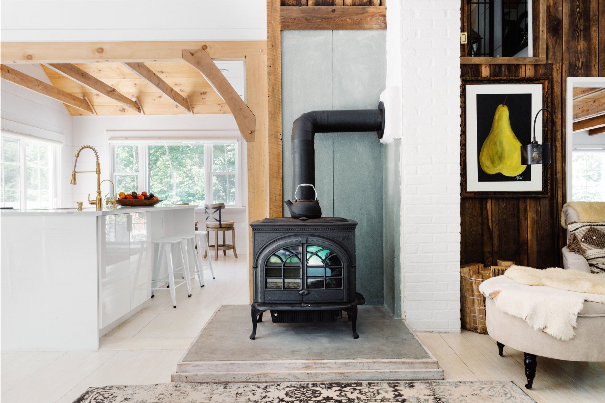 “I bought it for $18,000, which is unheard of,” Skrabak says of the home, which is located in Phoenicia in New York’s Catskills. The first thing the designer did was rip out everything that wasn’t structural. Once the house was completely gutted, she had a blank canvas from which she could create a brand-new floor plan. She wanted a space that could be a showcase for her business, but also work as a part-time home for her family, which became even more imperative when she found out—just two months after buying!—that she was pregnant.