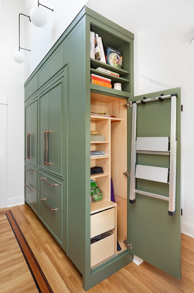 “I begin every project with a thorough inventory of items, then I find where the full-height storage will go,” says Dyer. Luckily, the room had an empty wall that could fit the fridge, pantry, and broom closet. The designer planned dedicated drawers for every container, bowl, and spice jar and came up with a custom baking station to house appliances and ingredients. “I love my new old-fashioned larder,” says Hixon. “Stephanie created cupboards that are sized perfectly for pint, quart, and half-gallon jars, and it’s amazing how much they can store!”