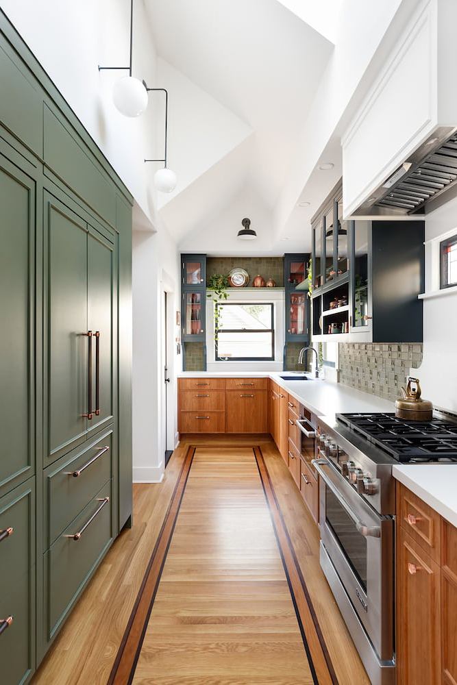 On the opposite side, Dyer imagined a full-length counter with glass upper cabinets, plate racks, and display shelves above the windows. To tone down the red and green scheme, she painted the back of the cupboards an electric orange to serve as a contrasting backdrop for the couple’s dinnerware collection. The outside received a coat of deep teal. Dyer then applied an olive hue to the pantry doors, but left the lower cherrywood cabinetry in its natural state. “Its grain resembles walnut, but its tone looks like aged fir,” she explains. “It also patinas quickly and has historic roots in Craftsman homes.” Bonus: It complemented the moss and copper shades.