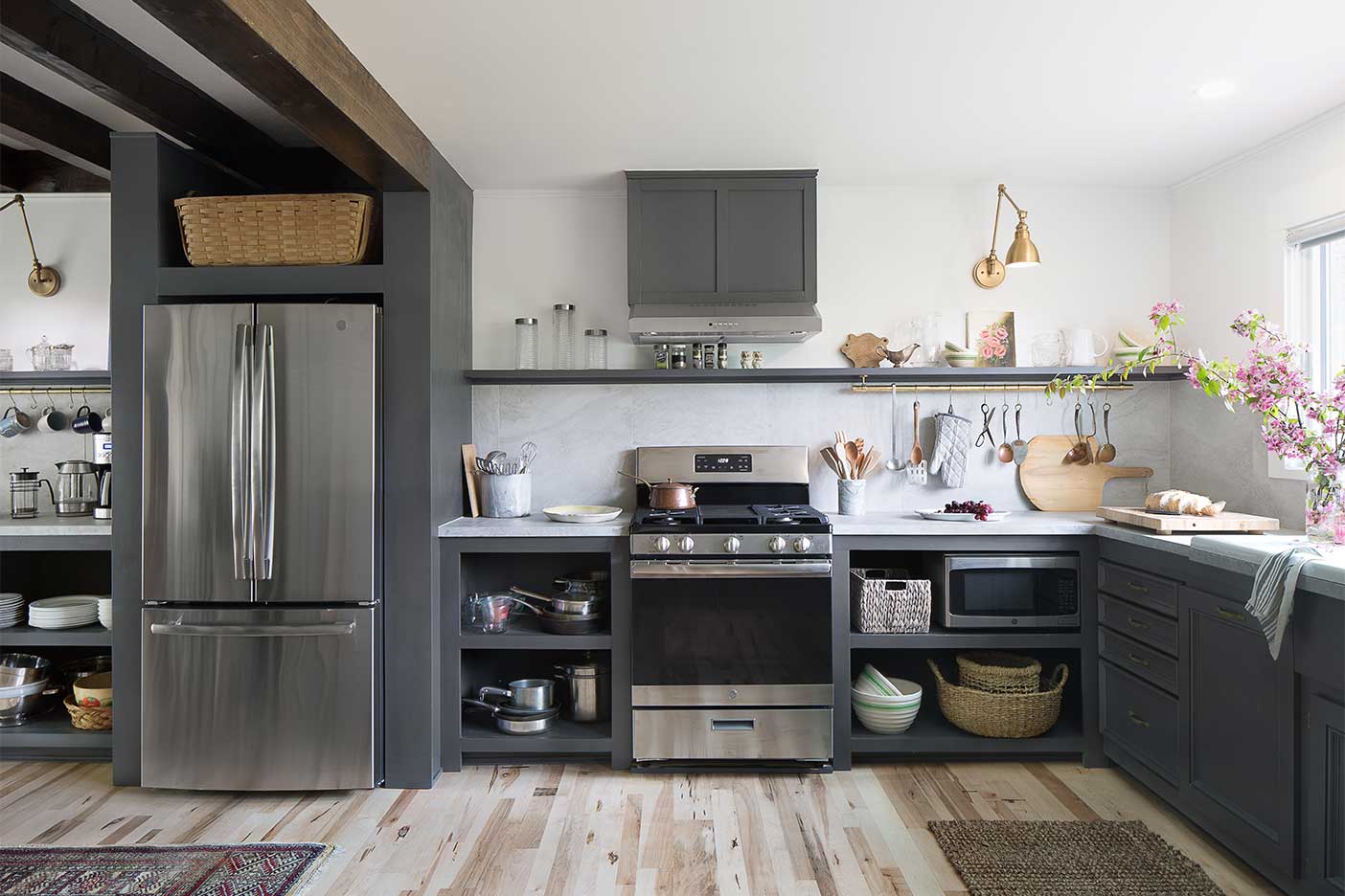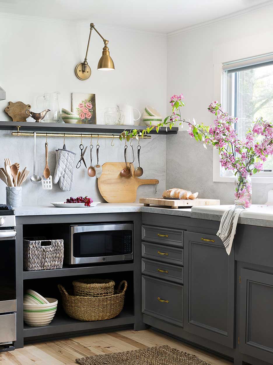 The majority of the cabinets couldn’t be salvaged, save for the ones that line the sink wall. To cut costs, Palmisano installed open shelves (another contractor creation) and painted everything a peppercorn gray, even the shelf that lines the backsplash, which is a simple 2-by-6 from Home Depot.